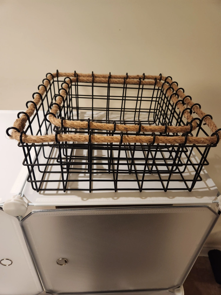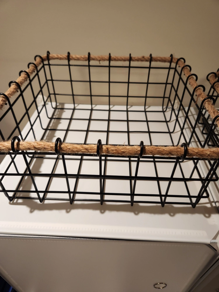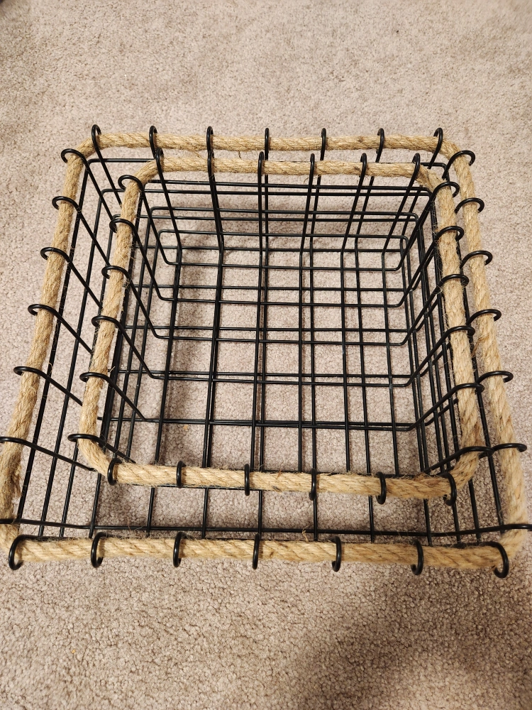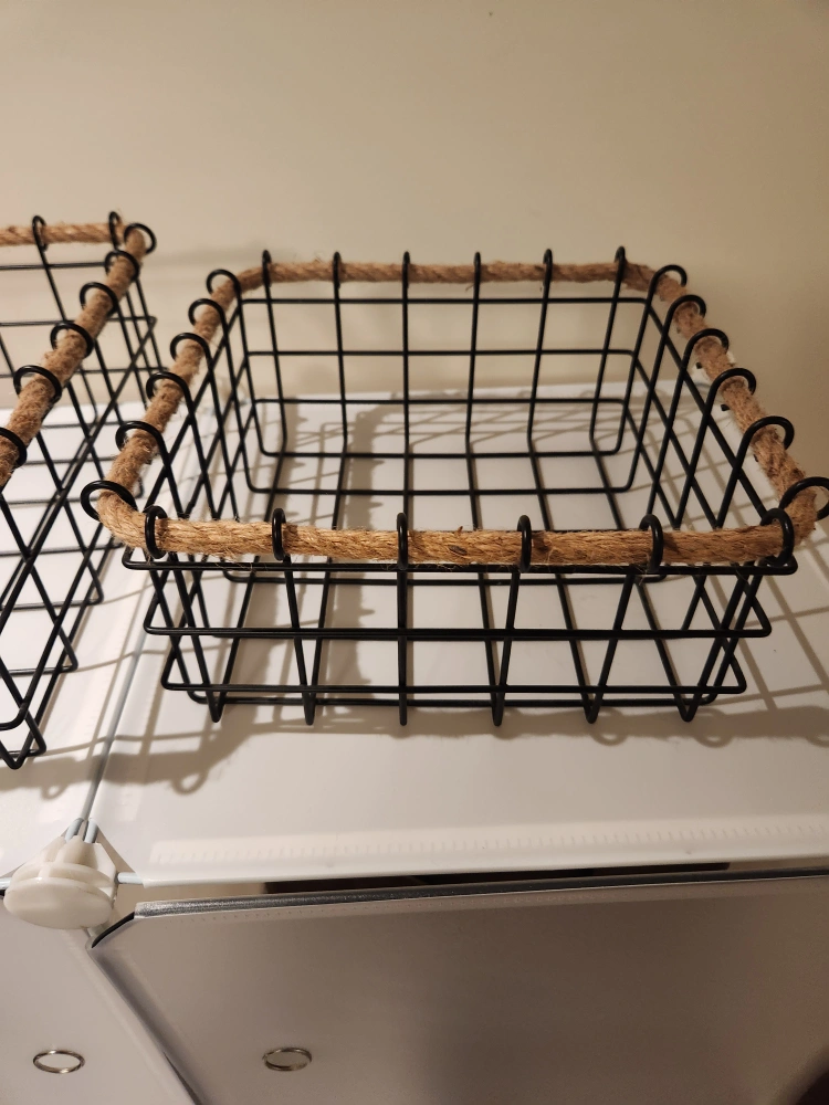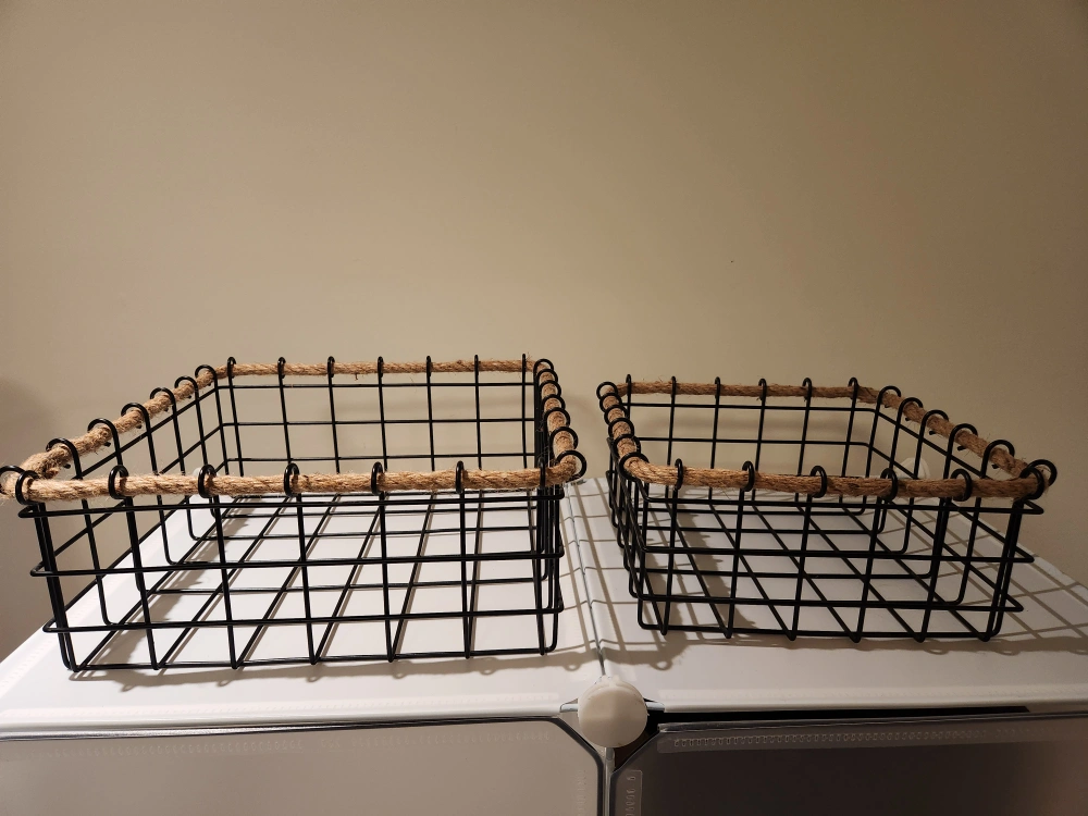 Selling a set of two wire storage baskets. They are black metal with jute rope trim. Perfect for organizing your space!