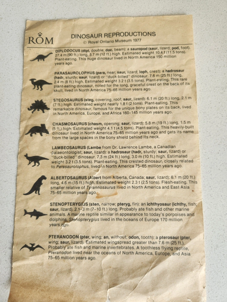 Selling a complete set of 11 vintage toy dinosaurs issued by the Royal Ontario Museum (ROM) in 1977. These have not been sold in years and are a rare find — especially as a full set. The set comes with the original printed paper insert describing each species. Also included: a few extra non-ROM toy dinosaurs as a bonus, and some duplicates from the original set. All items (except one duplicate) are in good vintage condition and will be shown clearly in photos.