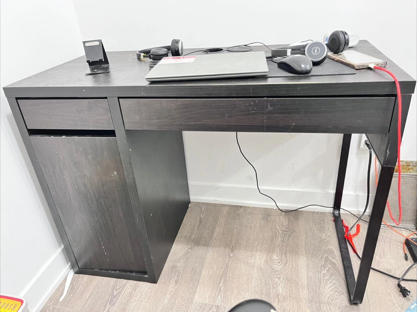 Selling a ikea dark brown desk that's perfect for a home office or study space. It features a convenient drawer for storage, helping you keep your workspace tidy and organized. The desk has a simple, modern design that would fit well in various room settings. It's in good condition and ready for a new home!