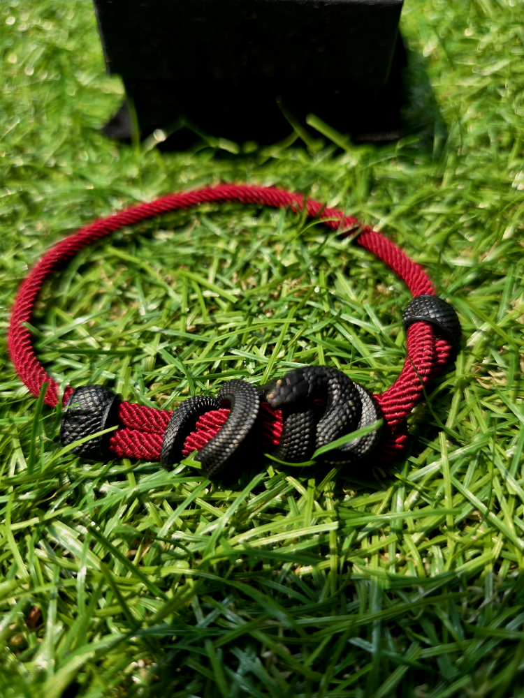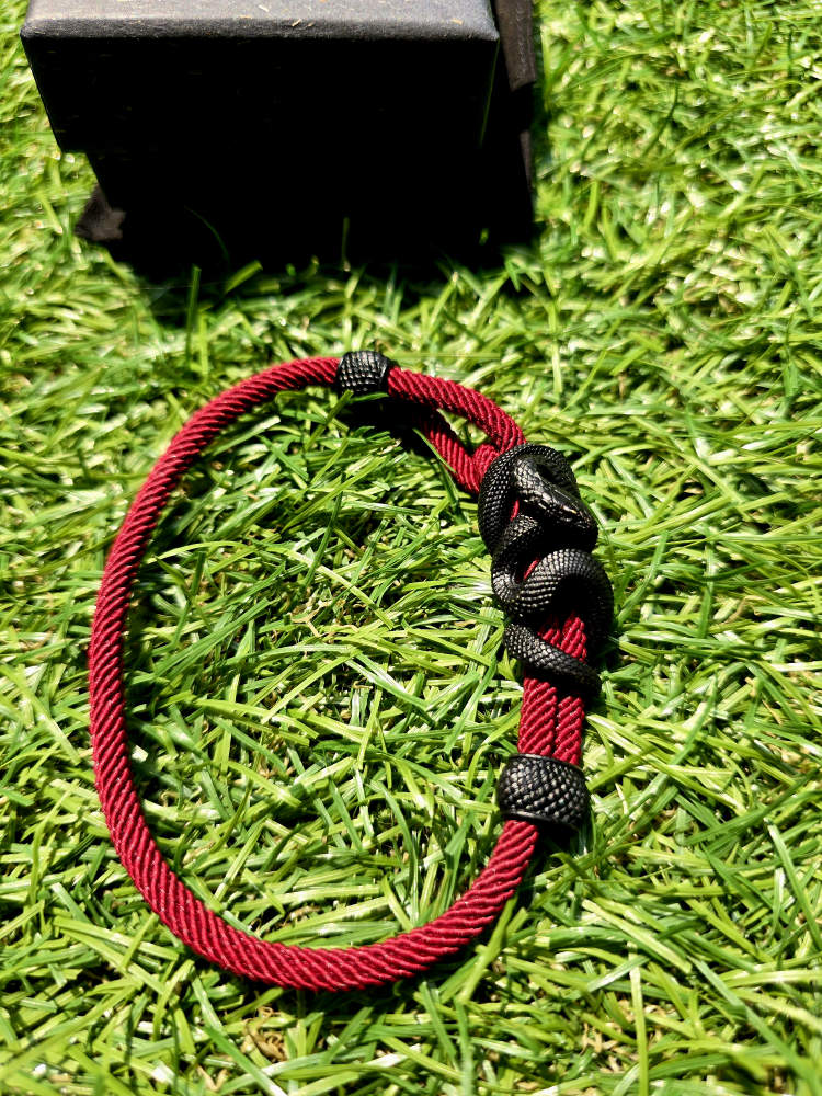 This is a black Mamba bracelet featuring a black snake design. It has a red cord and comes with its box.