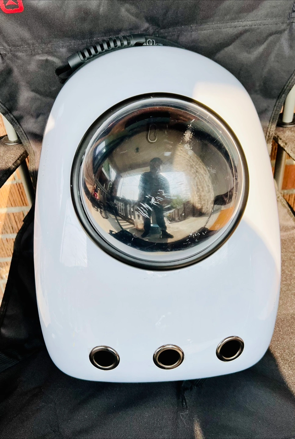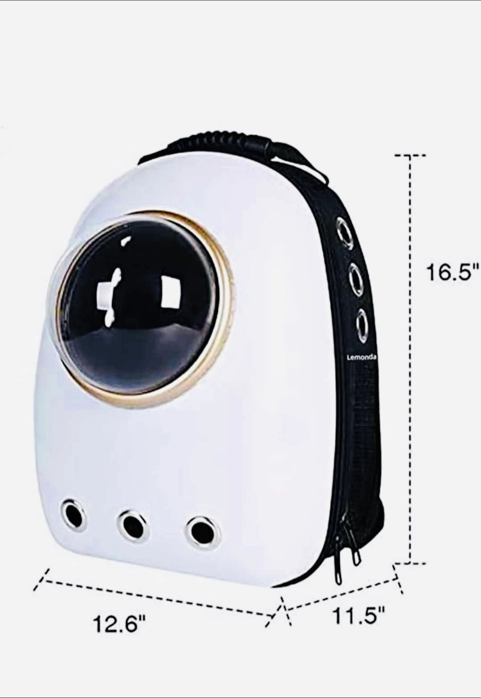 Looking to give your furry friend the best view while on the go? This Lemonda pet carrier backpack is perfect! It's in white and features a bubble window so your pet can enjoy the scenery. Dimensions are approximately 16.5" x 12.6" x 11.5".