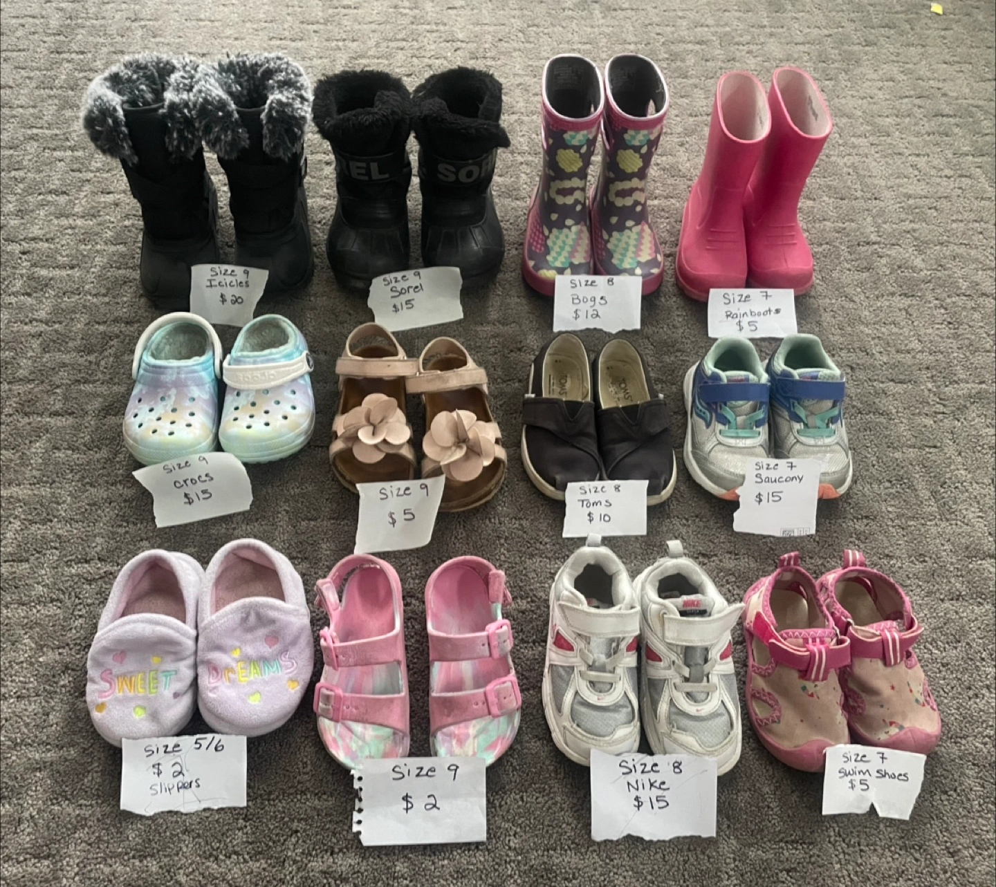 28Selling a bundle of kids' shoes in sizes ranging from 5/6 to 9. Includes brands like Crocs (size 9), Sorel (size 9), Nike (size 8), Toms (size 8), Bogs (size 8), Saucony (size 7), and more! Great variety for your little one. Prices and size in pic