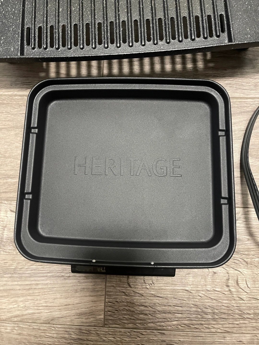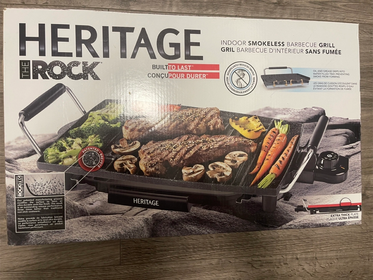 Get ready to grill indoors with The Rock Heritage smokeless BBQ grill! This grill features: - A 16" x 10" extra thick base for even heat distribution and stability. - A convenient drip tray water refill channel. - Removable variable temperature control. Enjoy smokeless grilling with this Heritage model! Used once