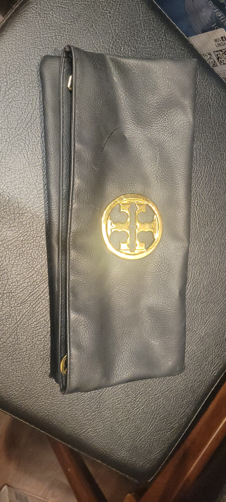 Selling a Tory Burch black leather clutch. It features a gold-tone logo emblem on the front. It's in good condition, perfect for a night out or special occasion