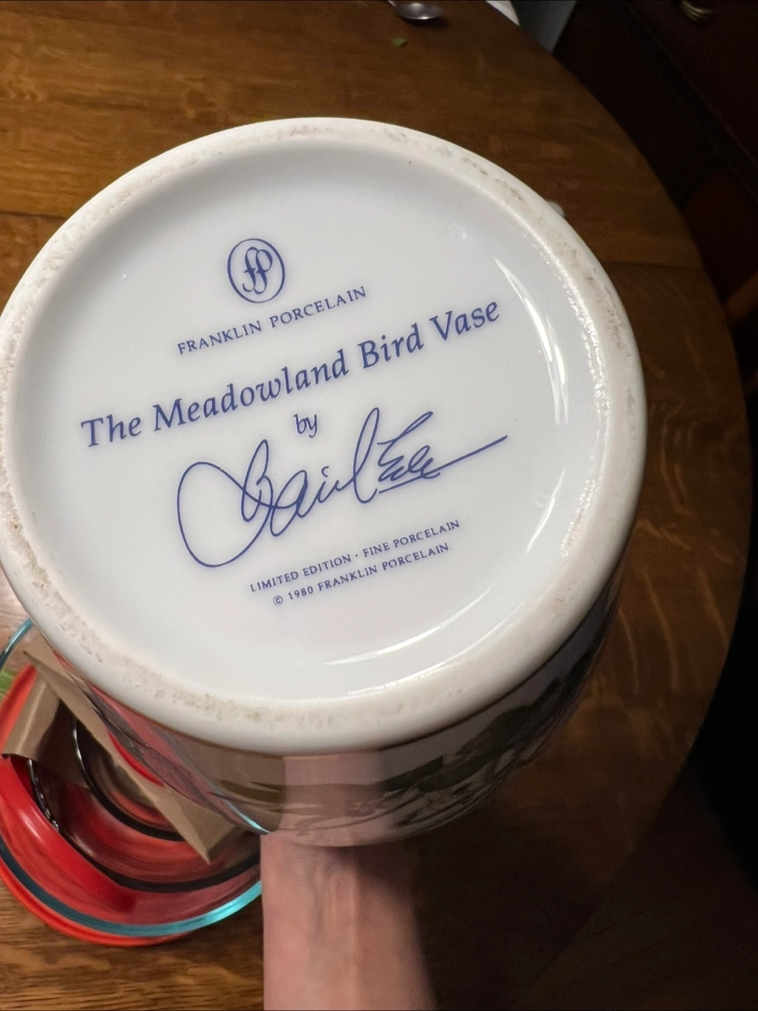 Selling a lovely gold plated Franklin Porcelain vase called 'The Meadowland Bird Vase'. It's a limited edition piece featuring beautiful bird and floral designs. Perfect for adding a touch of elegance to any room!