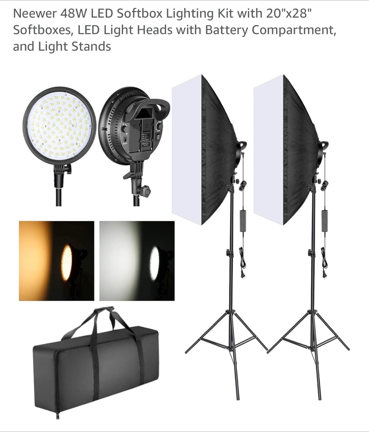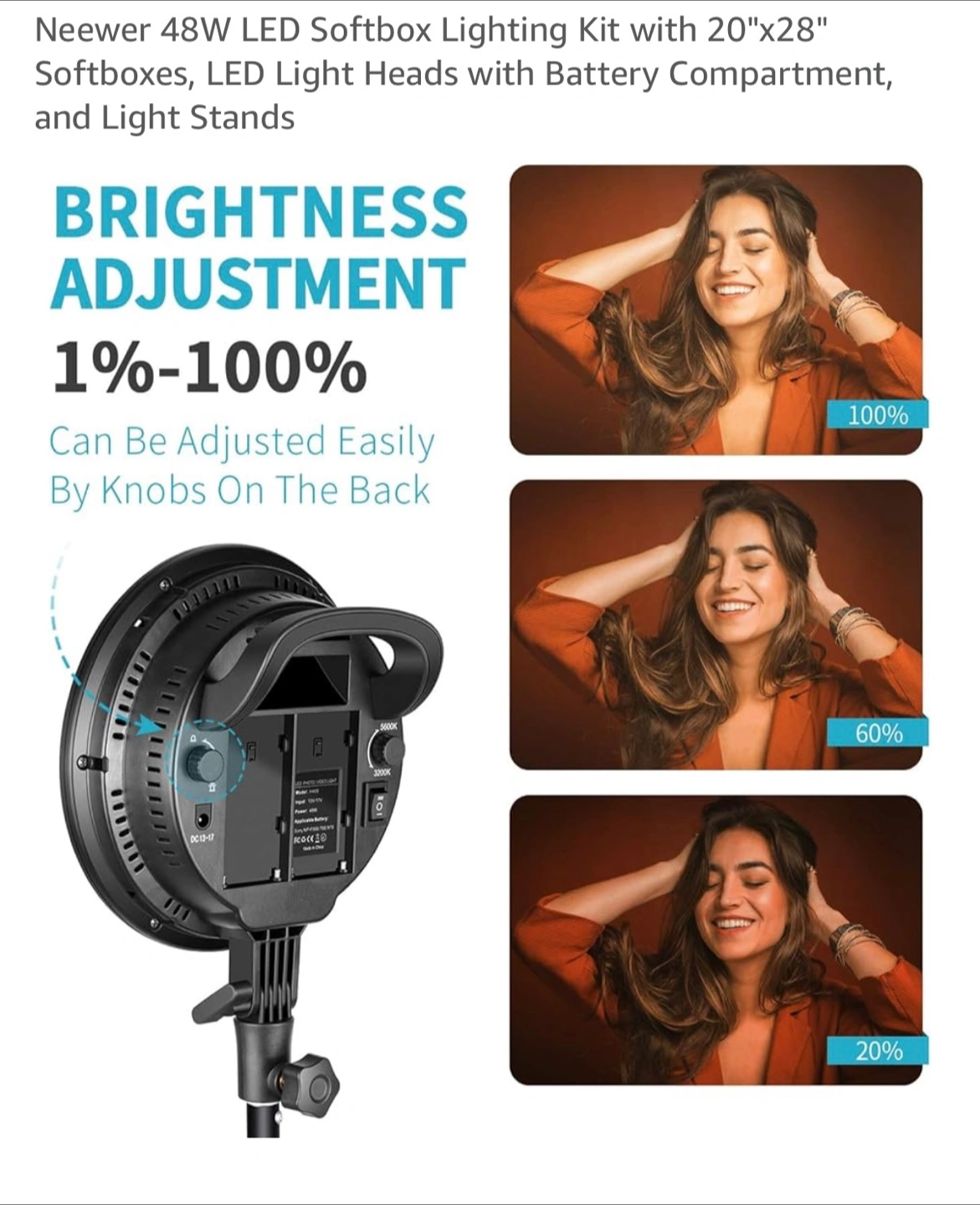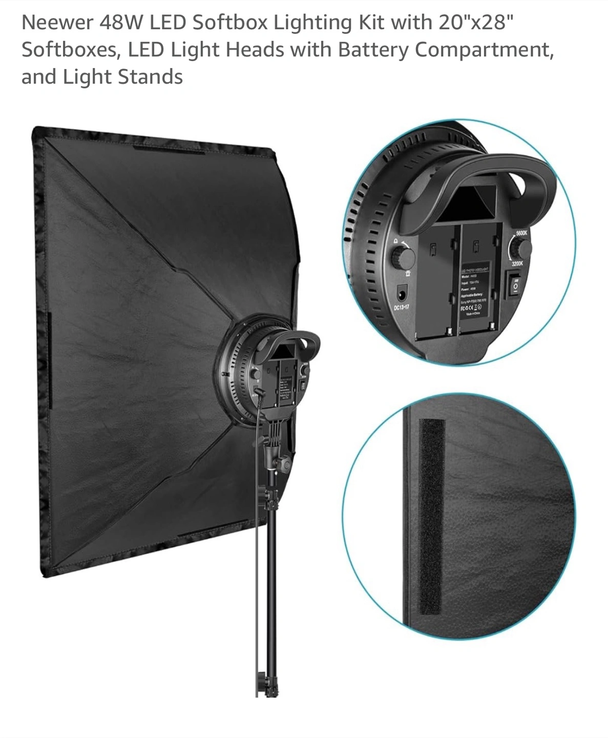 Selling a brand new, never used, Neewer 48W LED Softbox Lighting Kit with 20"x28" Softboxes. This kit includes (qty. 2) LED light heads with AC adapter and battery compartment, (qty.2) aluminum alloy light stands, and (qty. 2) rectangular soft boxes. It features a double color temperature with a 3200K-5600K dimmable lighting system. The brightness can be adjusted easily from 1% to 100% using the knobs on the back. Great for photography and video!