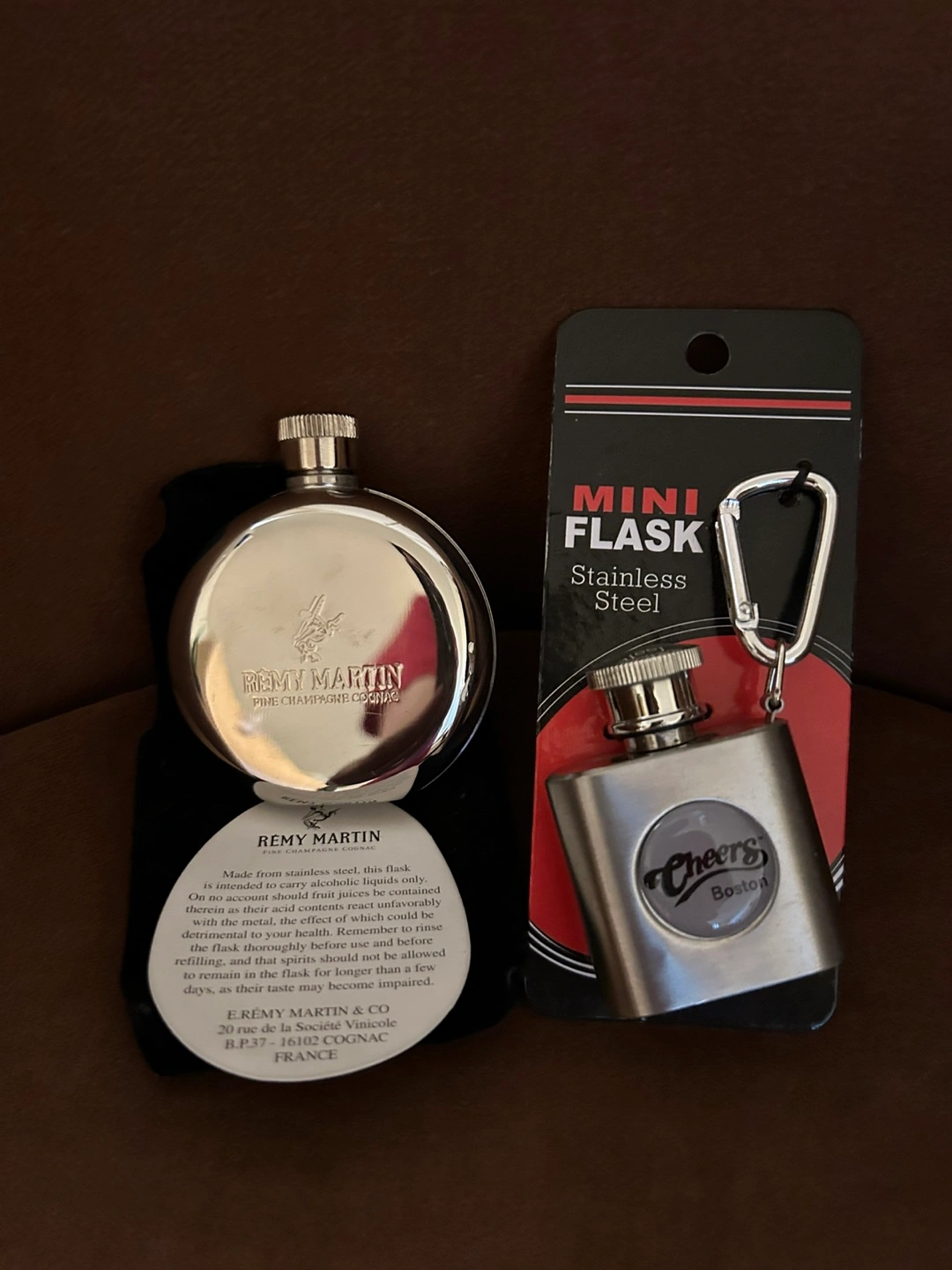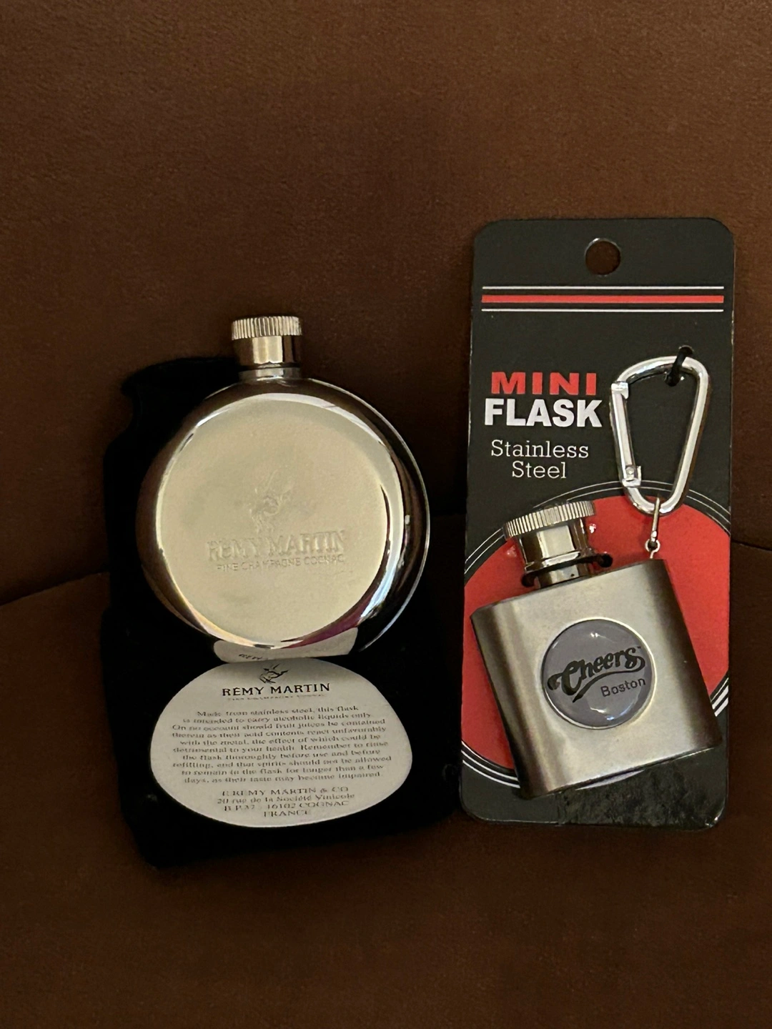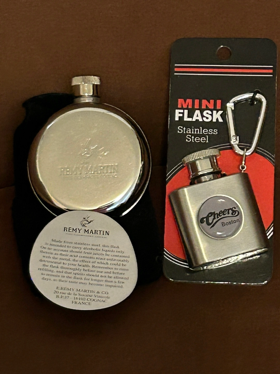 Selling two mini flasks! One is a Remy Martin flask with a round design and comes with a black pouch. The other is a Cheers Boston stainless steel mini flask with a carabiner clip. Both are in great condition and ready for a new home 5 /each. Check my other item pls thx
