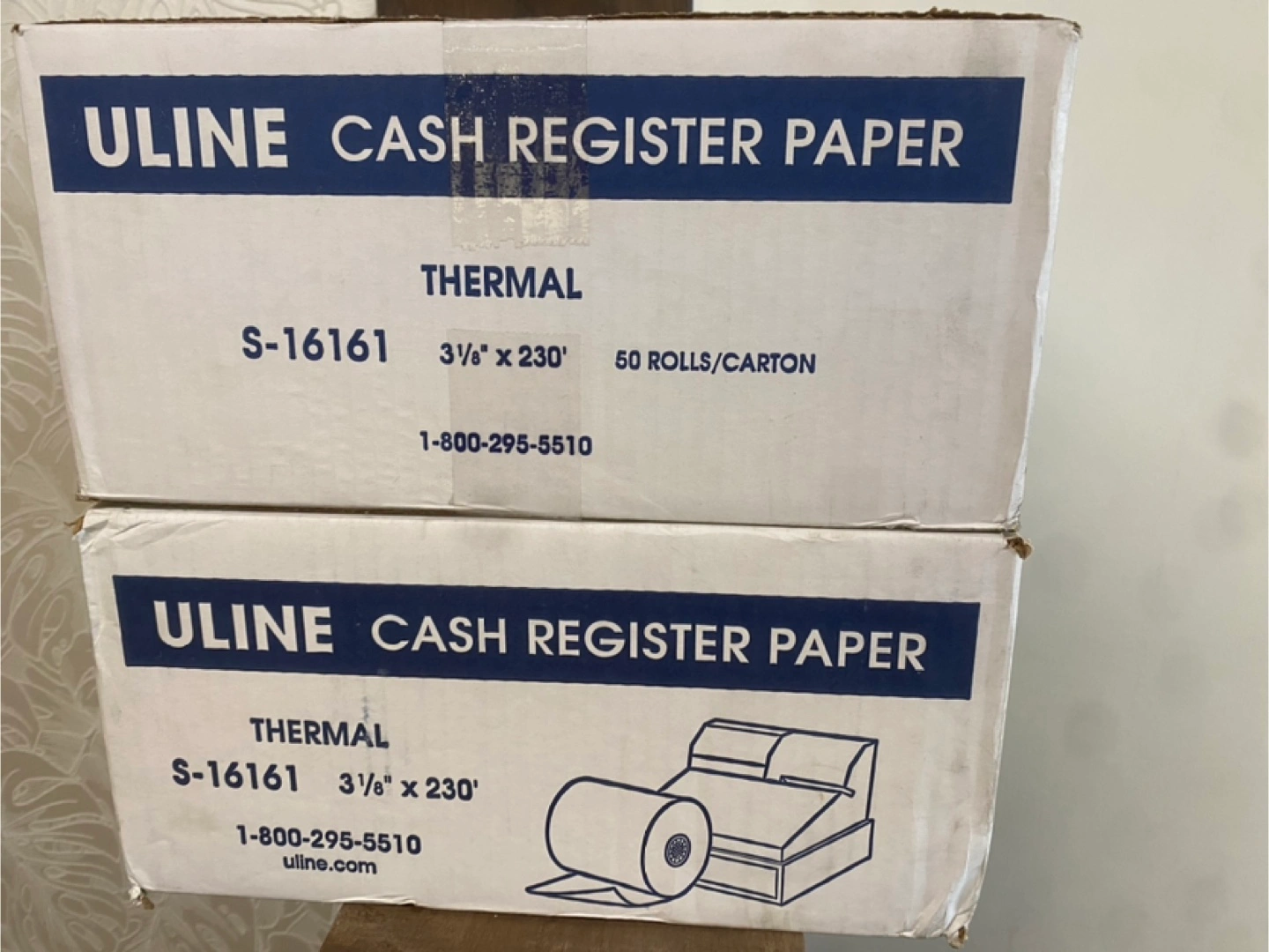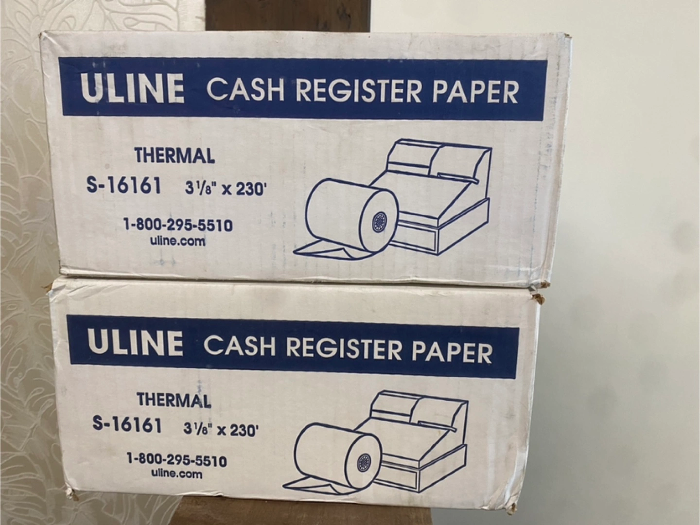Selling Uline Cash Register Paper, thermal, size 3 1/8" x 230'. Each carton contains 50 rolls of paper. Great for businesses using cash registers! 2 box left