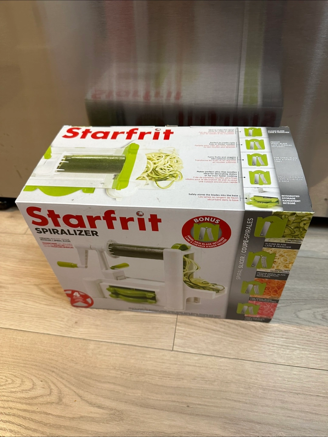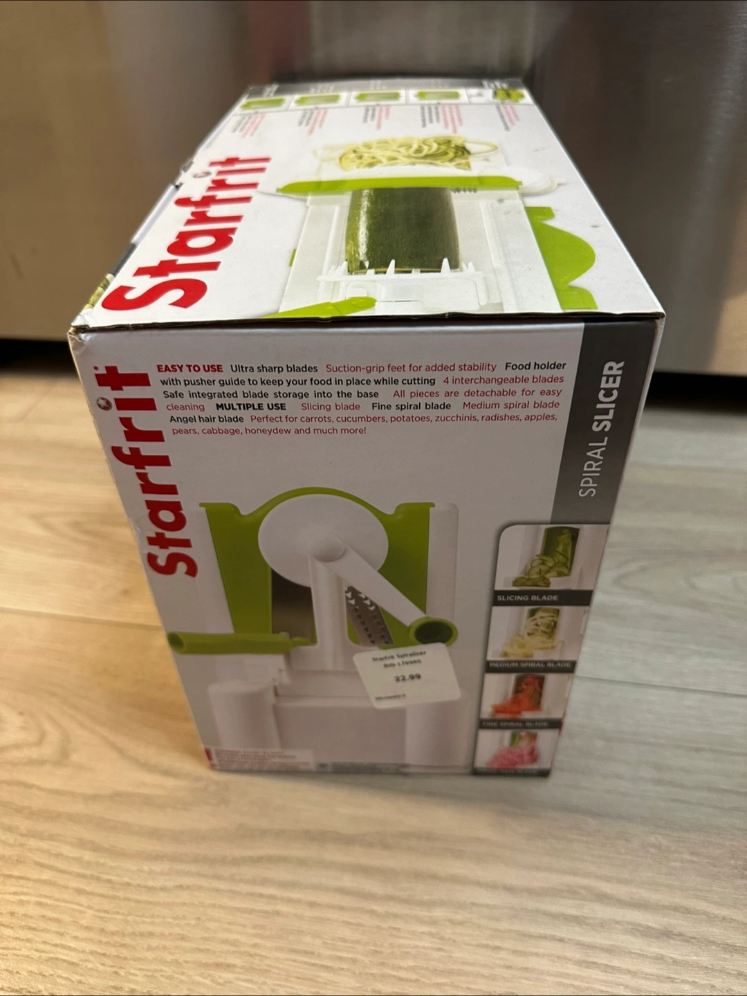 Selling a brand new Starfrit Spiral Slicer! It's still in its original box and ready to help you make perfect ultra-fine noodles for faster, even cooking. The suction-grip feet add stability while you're using it, and it comes with 4 interchangeable blades. The blades are detachable and easy to clean. Originally retailed for $22.99
