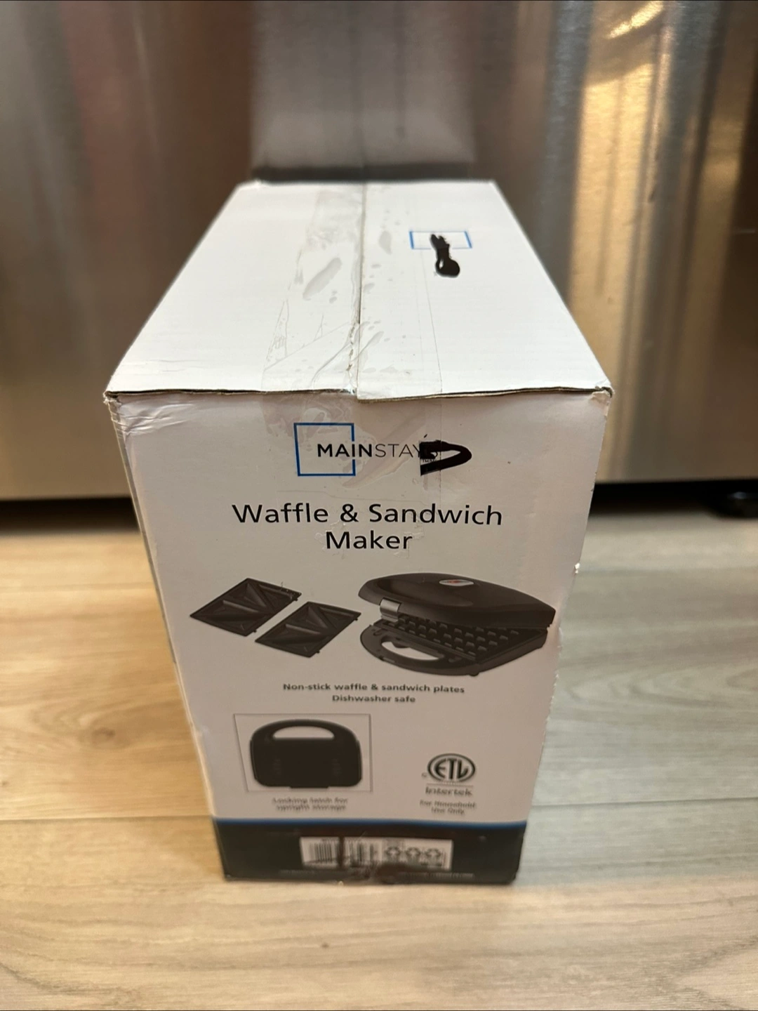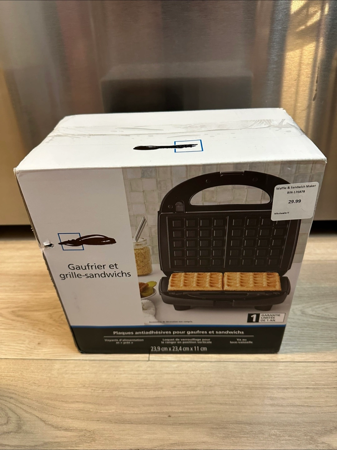 Selling a Mainstays waffle and sandwich maker. It comes with non-stick waffle and sandwich plates, and is dishwasher safe. The dimensions are 23.9 cm x 23.4 cm x 11 cm. Originally bought for $29.99!