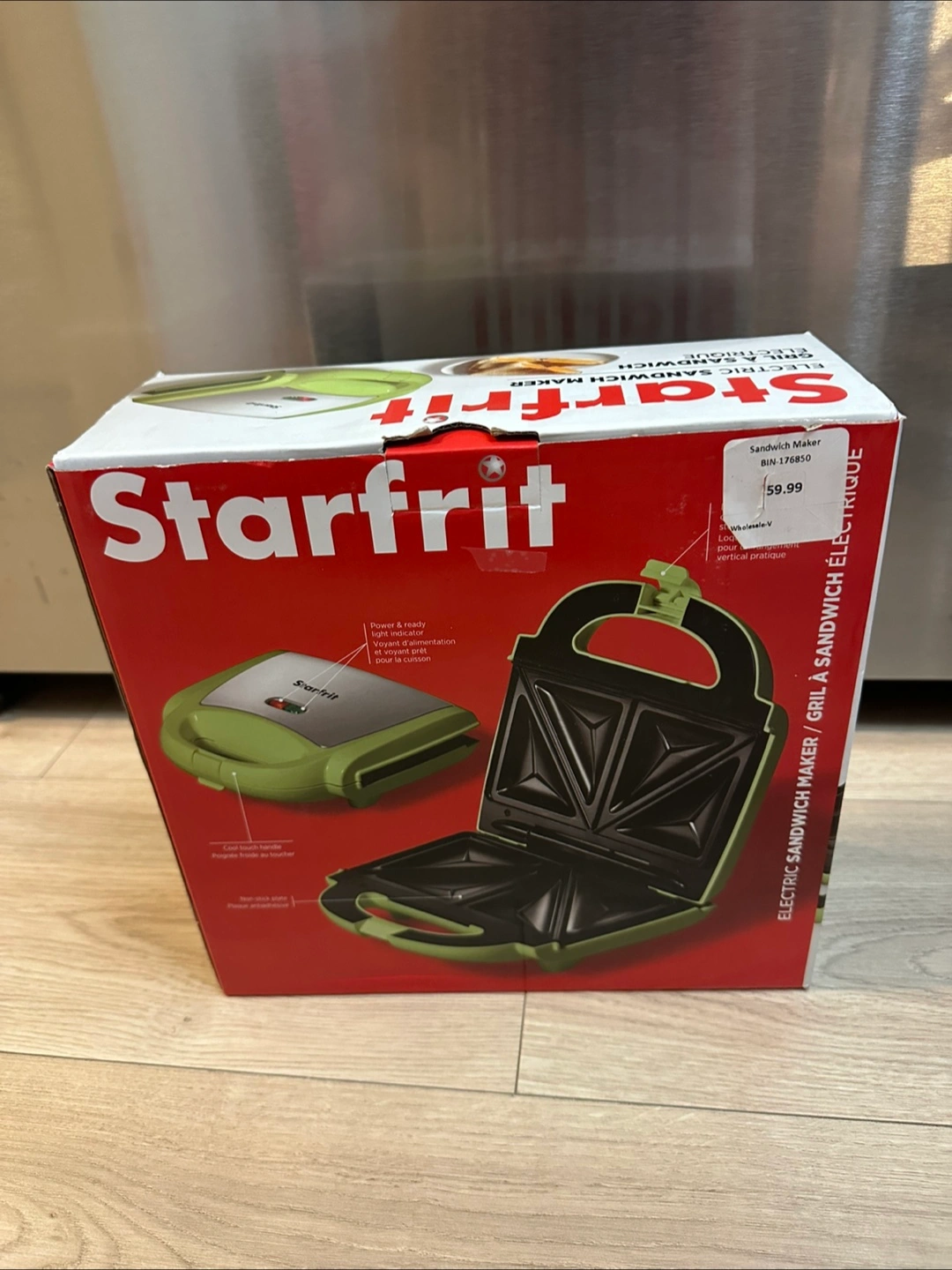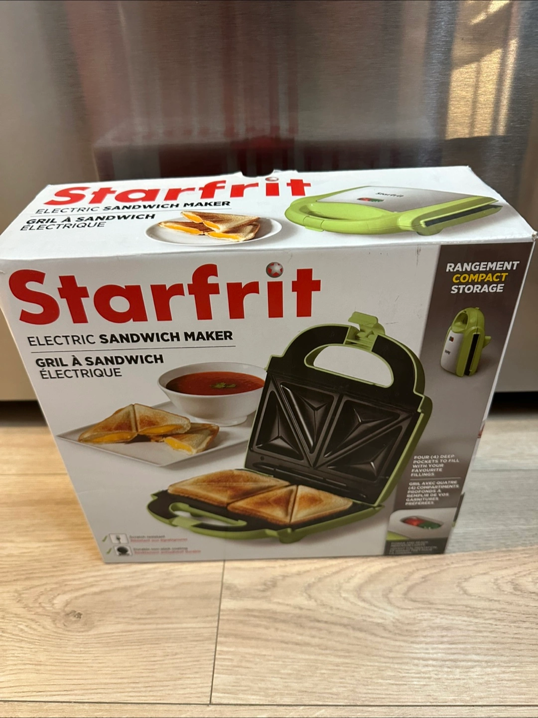 Selling a brand new Starfrit Electric Sandwich Maker, still in its original box! It's perfect for making quick and easy grilled sandwiches. The box shows it has compact storage, and it's ready to use with a power indicator light. Get ready for some delicious sandwiches!