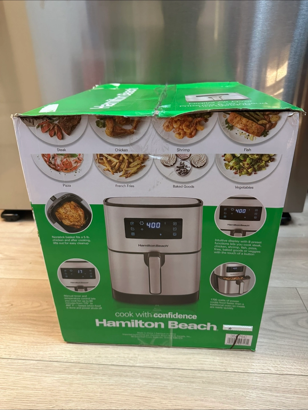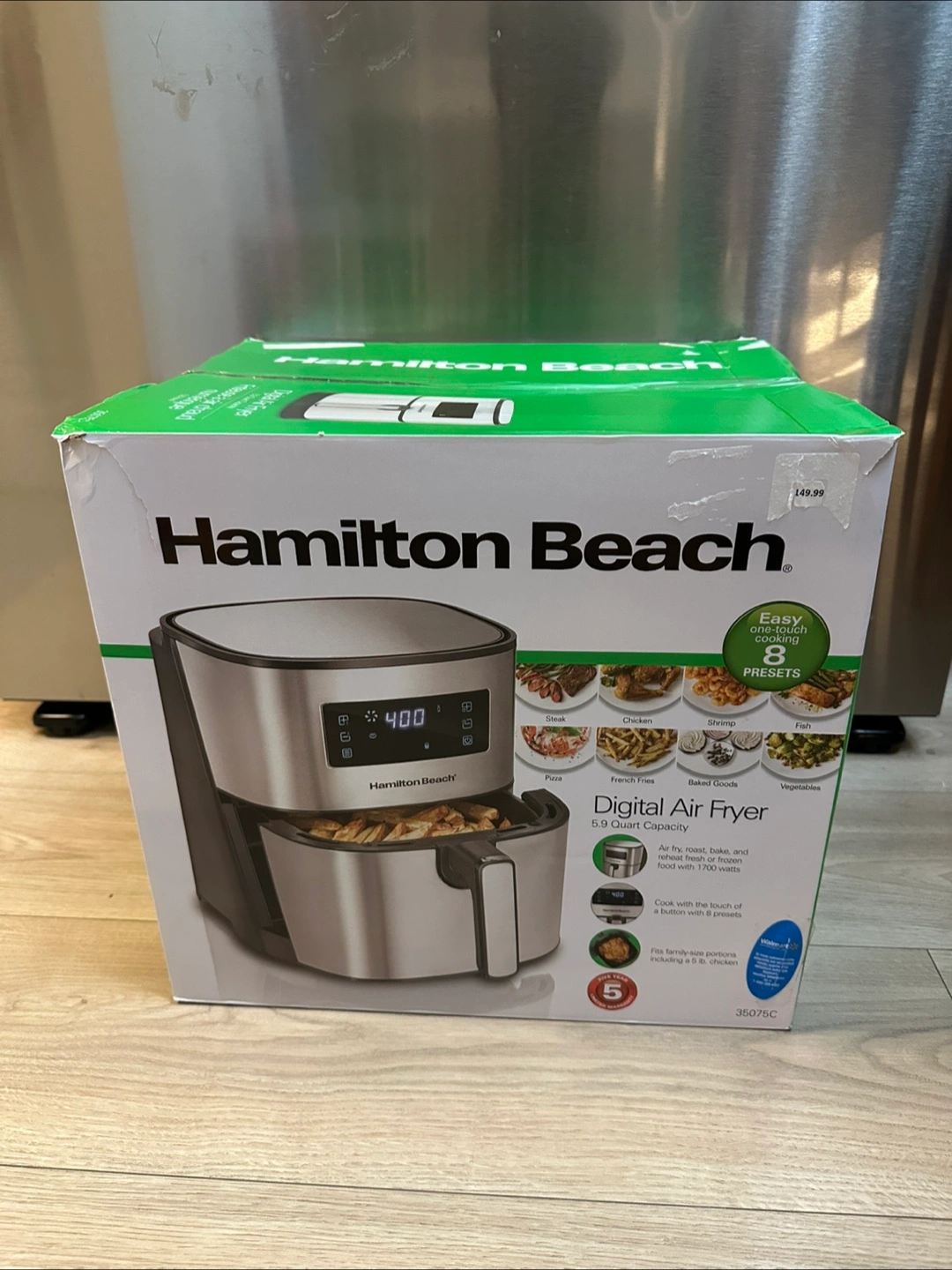 I'm selling a brand new Hamilton Beach Digital Air Fryer with a 5.9 quart capacity! It comes in its original box and features easy one-touch cooking with preset functions for steak, chicken, shrimp, fish, pizza, french fries, baked goods, and veggies. Cook with confidence!