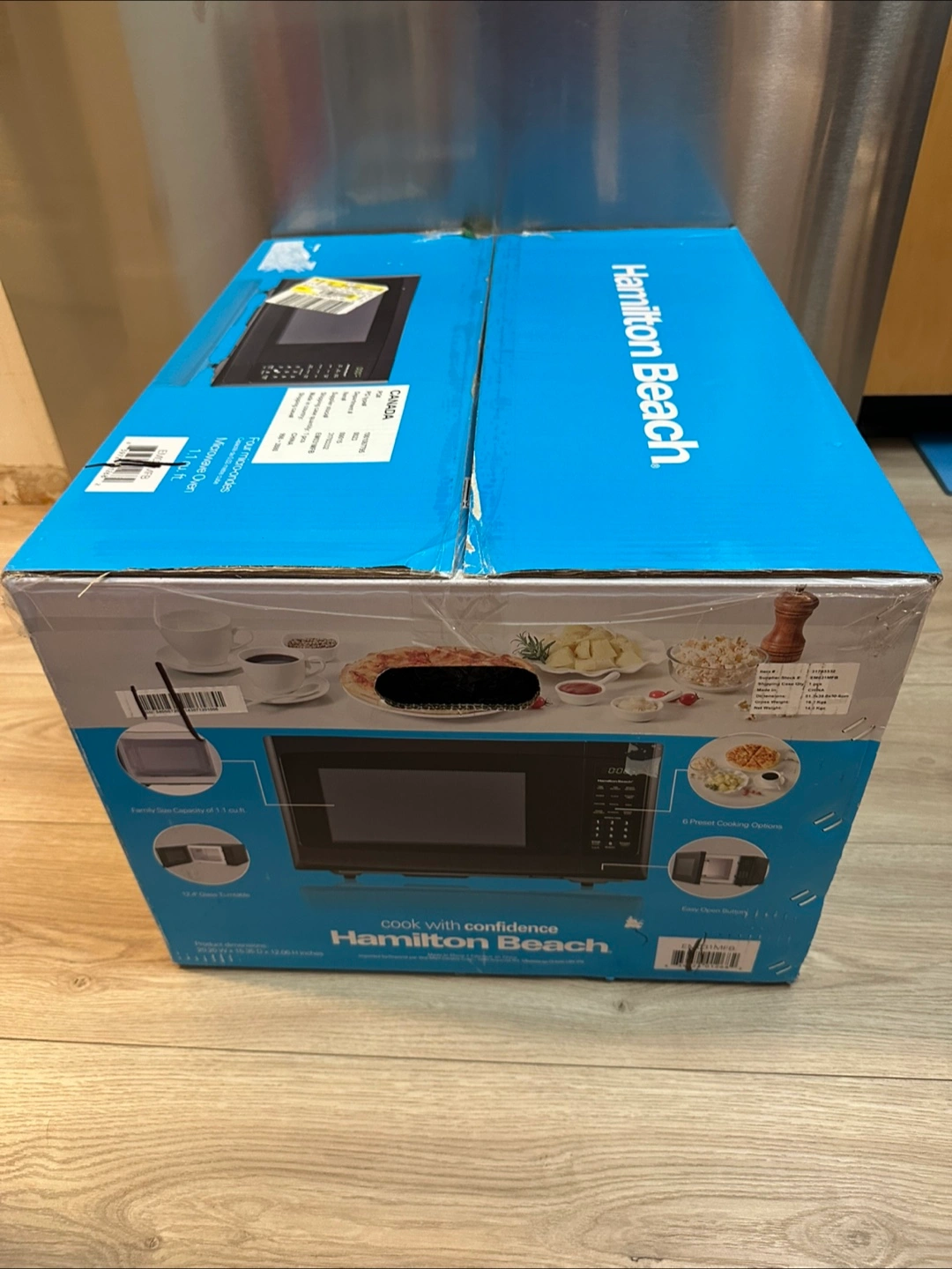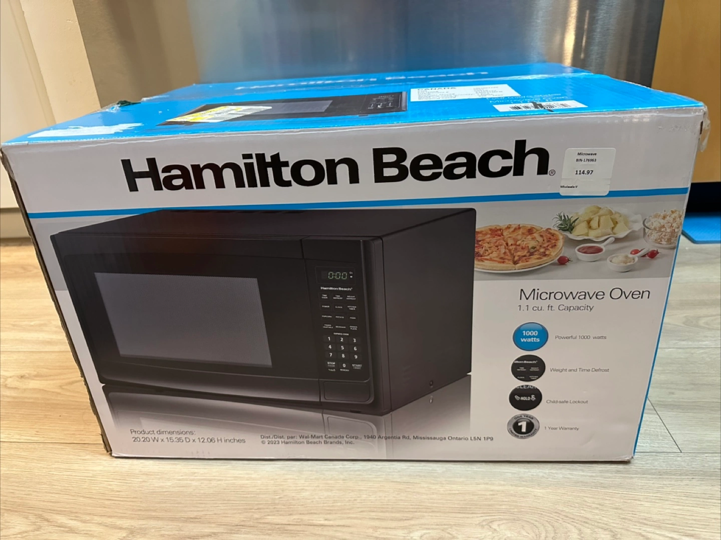 I'm selling a brand new Hamilton Beach microwave oven! It's a 1.1 cu ft capacity microwave with 1000 watts of power. It features weight and time defrost settings, a child-safe lockout, and comes with a 1-year warranty. The product dimensions are 20.20 W x 15.35 D x 12.06 H inches. The box is included