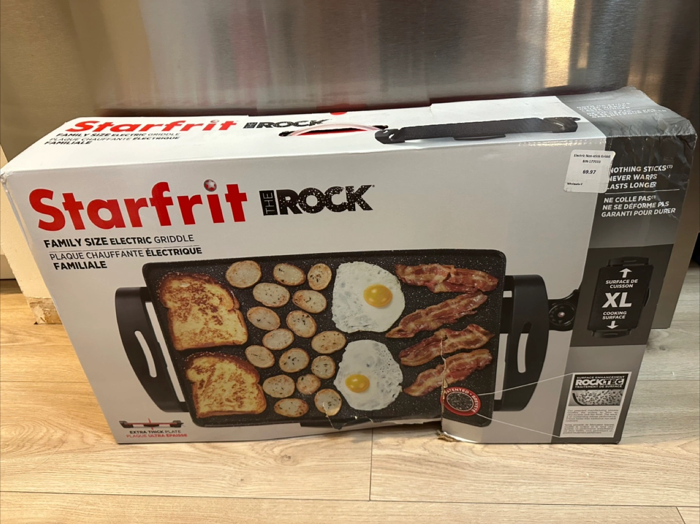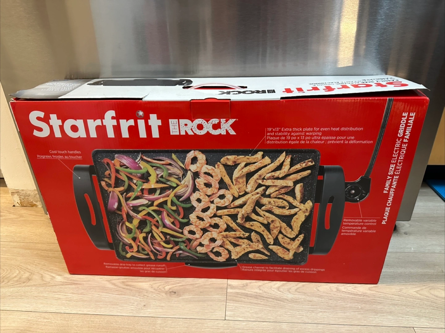 300I'm selling a brand new Starfrit The Rock family-size electric griddle! It's still in its original box. This griddle features an extra-thick plate for even heat distribution and stability against warping. It also has cool-touch handles and a removable variable temperature control. The griddle measures 19" x 13".