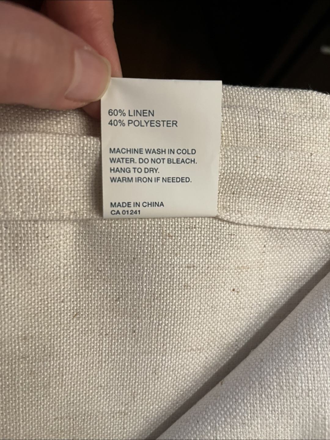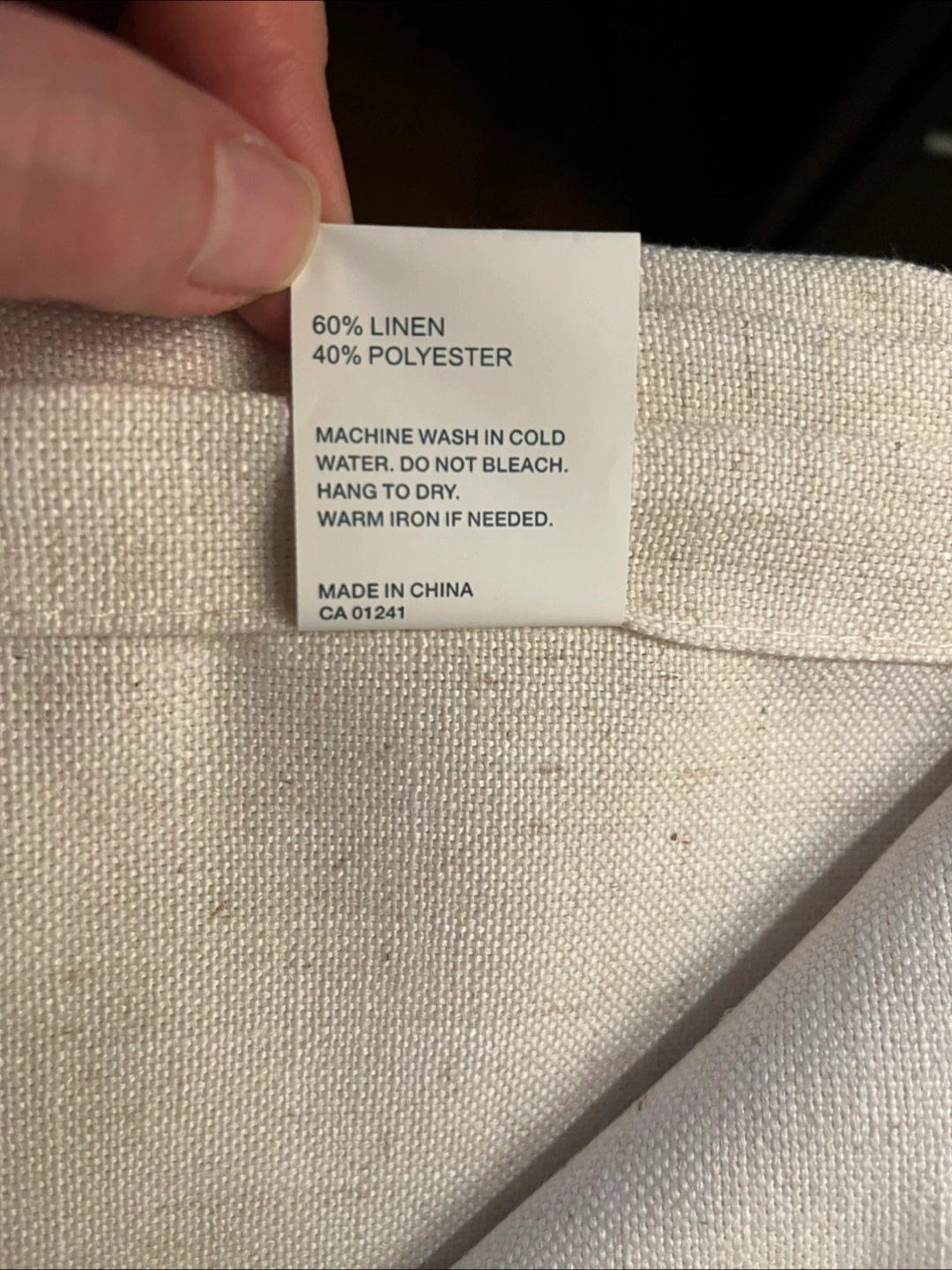 Standard size 60% linen and 40% polyester off-white curtain panels (52”x86”) from Simons. They have a lovely drape and allow medium light filtering.