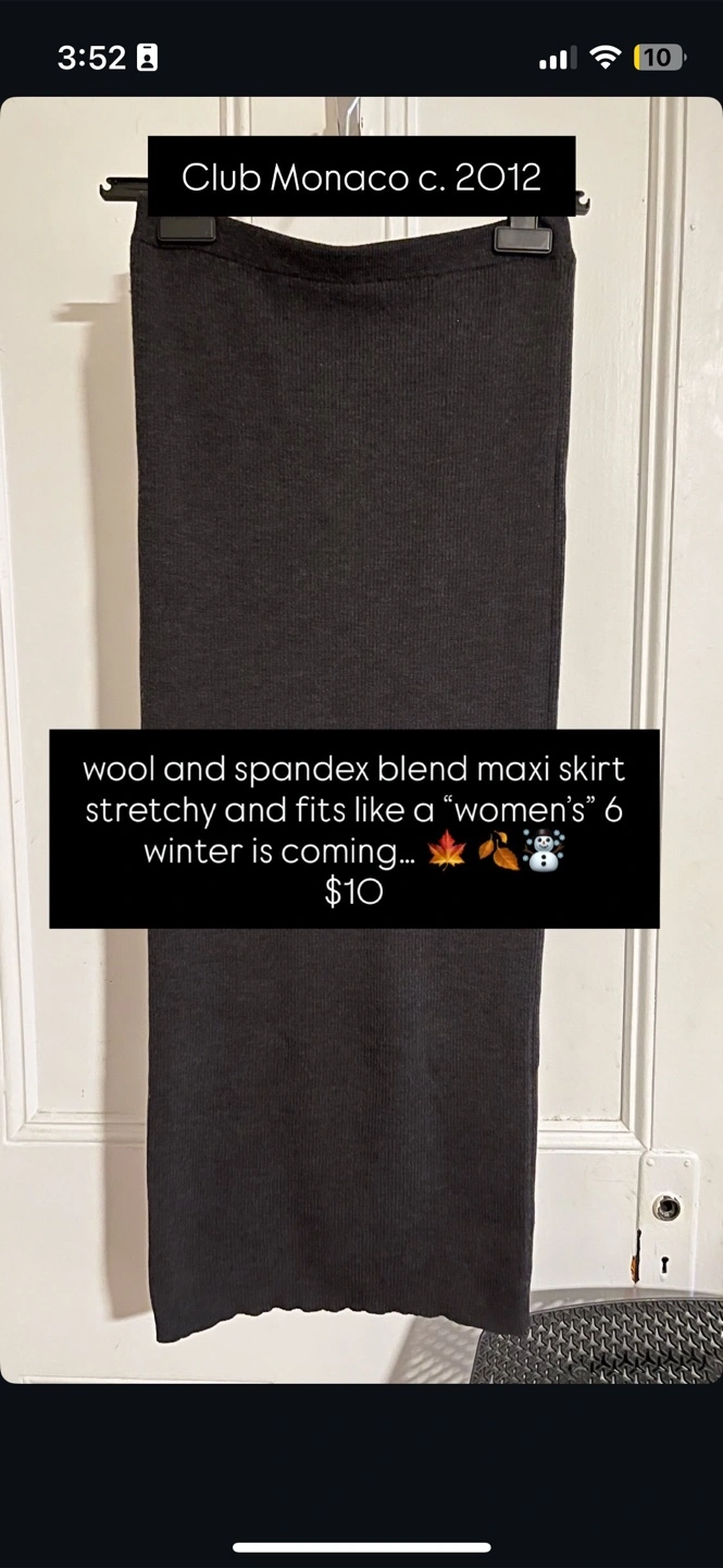 Selling a versatile Club Monaco charcoal grey wool and spandex blend elasticized maxi skirt.