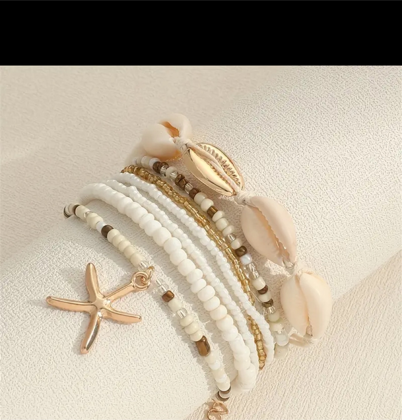 This is a cute beaded bracelet with shell and starfish charms! The bracelet features multiple strands of beads in white, gold, and brown tones, giving it a beachy vibe
