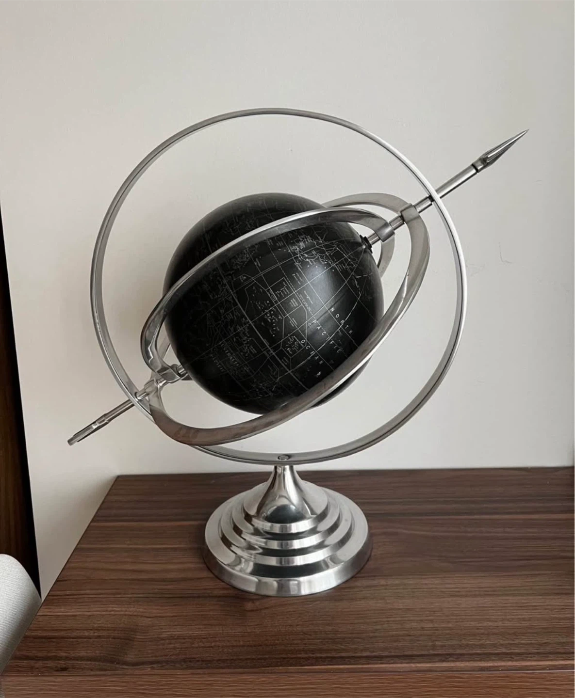 Add a touch of sophistication to your space with this decorative world globe! It features a sleek black globe with a stylish silver stand. It's in great condition and would look lovely on a desk or bookshelf