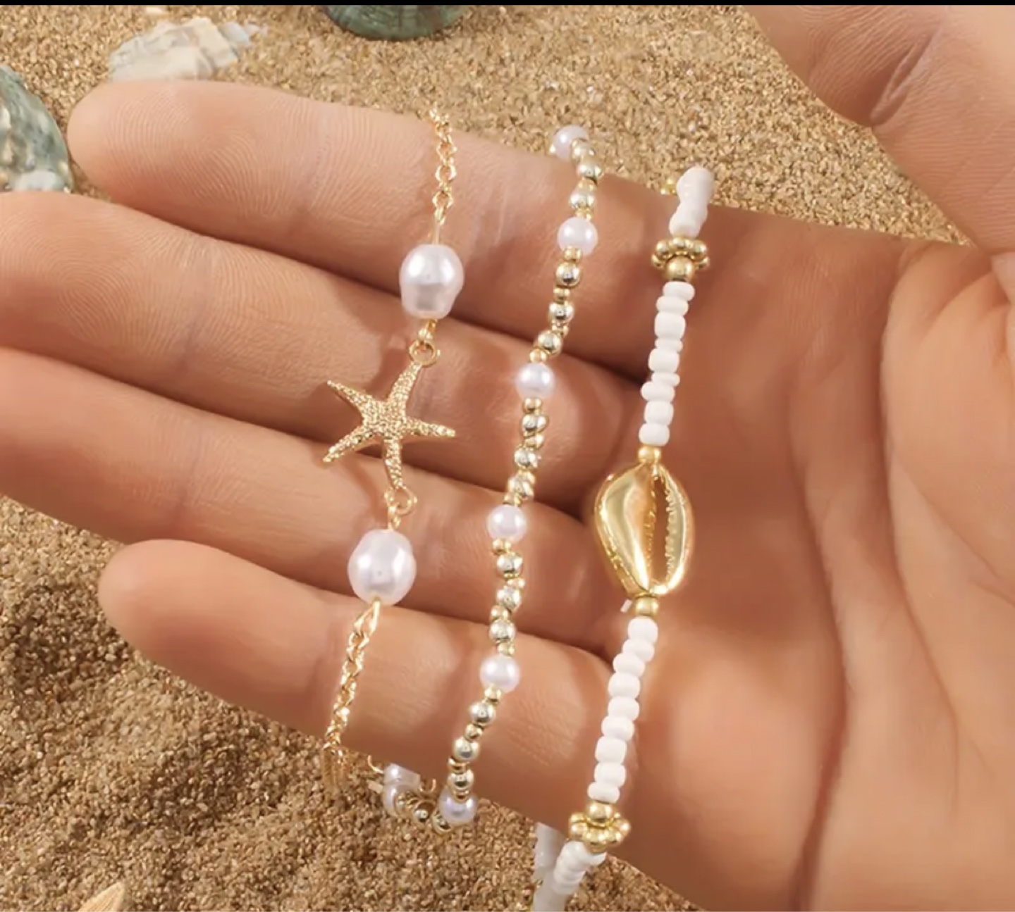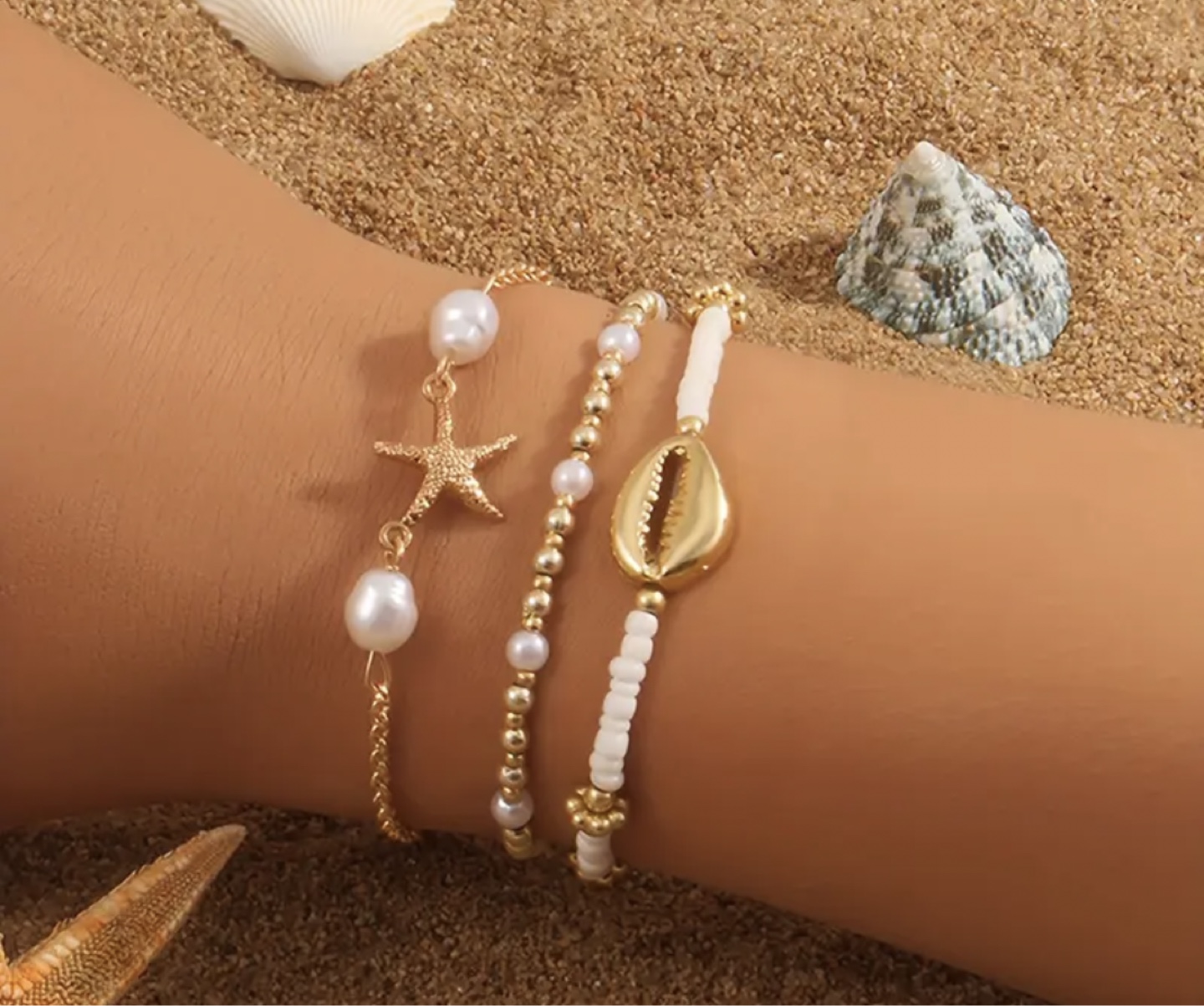 Here's a cute set of gold tone beaded bracelets! They feature pearl, starfish and shell charms. Perfect for adding a touch of summer to your look