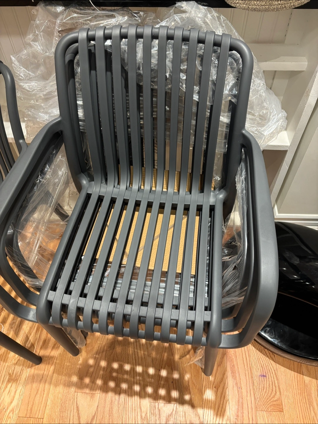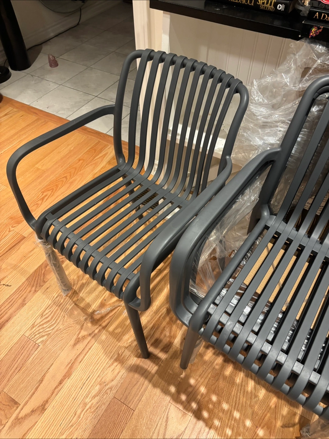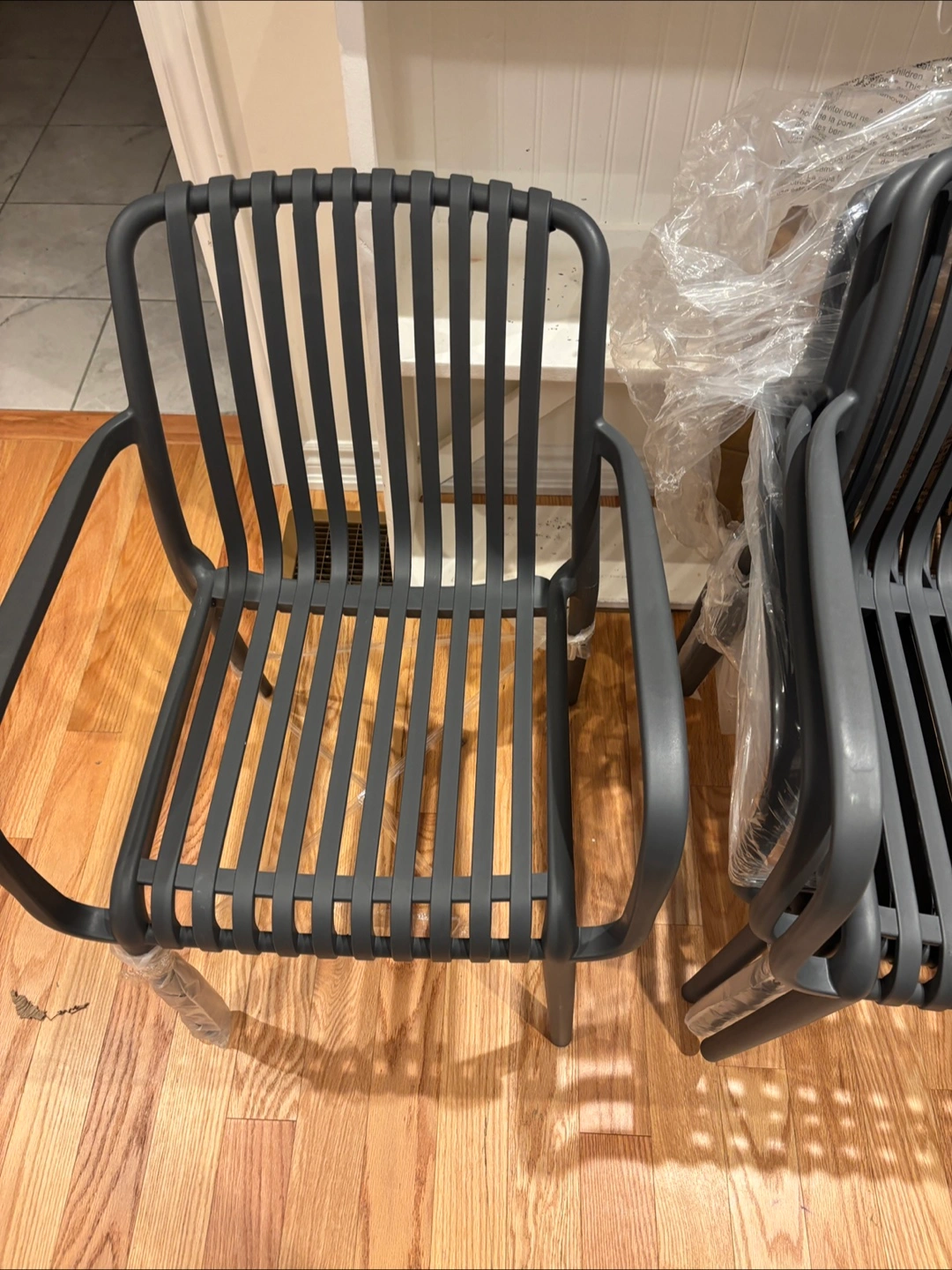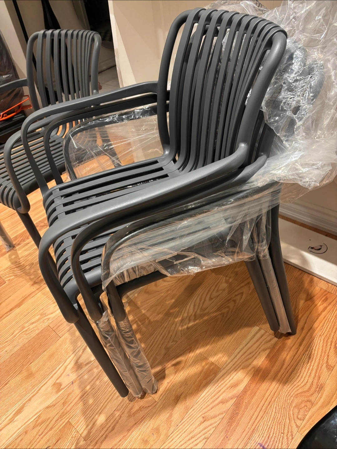 Selling a set of 4 Hokku Designs dining chairs! They're a stylish gray colour Very very strong Approximate dimensions: - Height: 31.5 in - Width: 18.5 in - Depth: 20.5 in - Seat Width: 16.5 in - Seat Height: 18.5 in Great for indoor or outdoor. Plastic dinning or patio chairs Available for delivery or pickup ( Delpark home center )