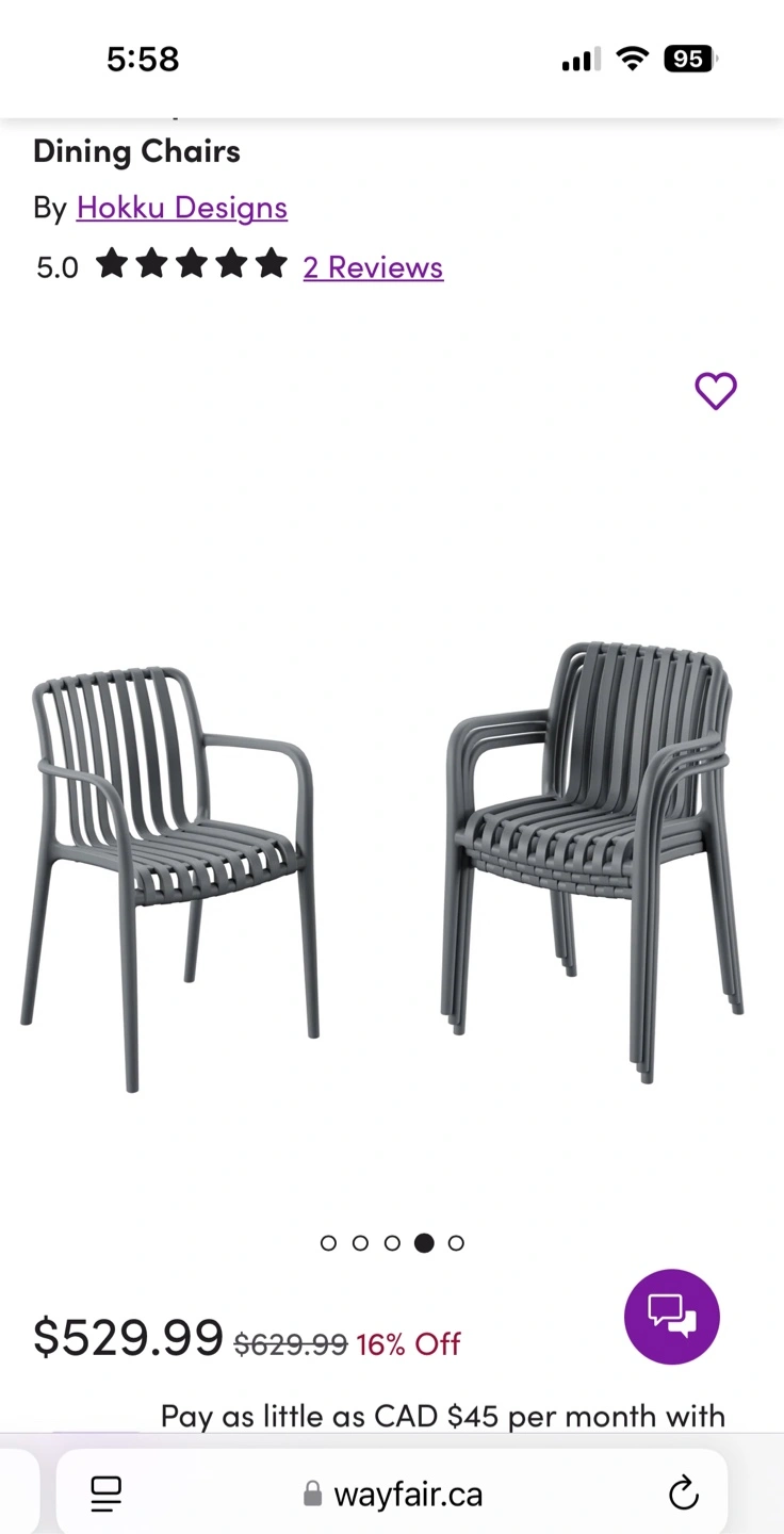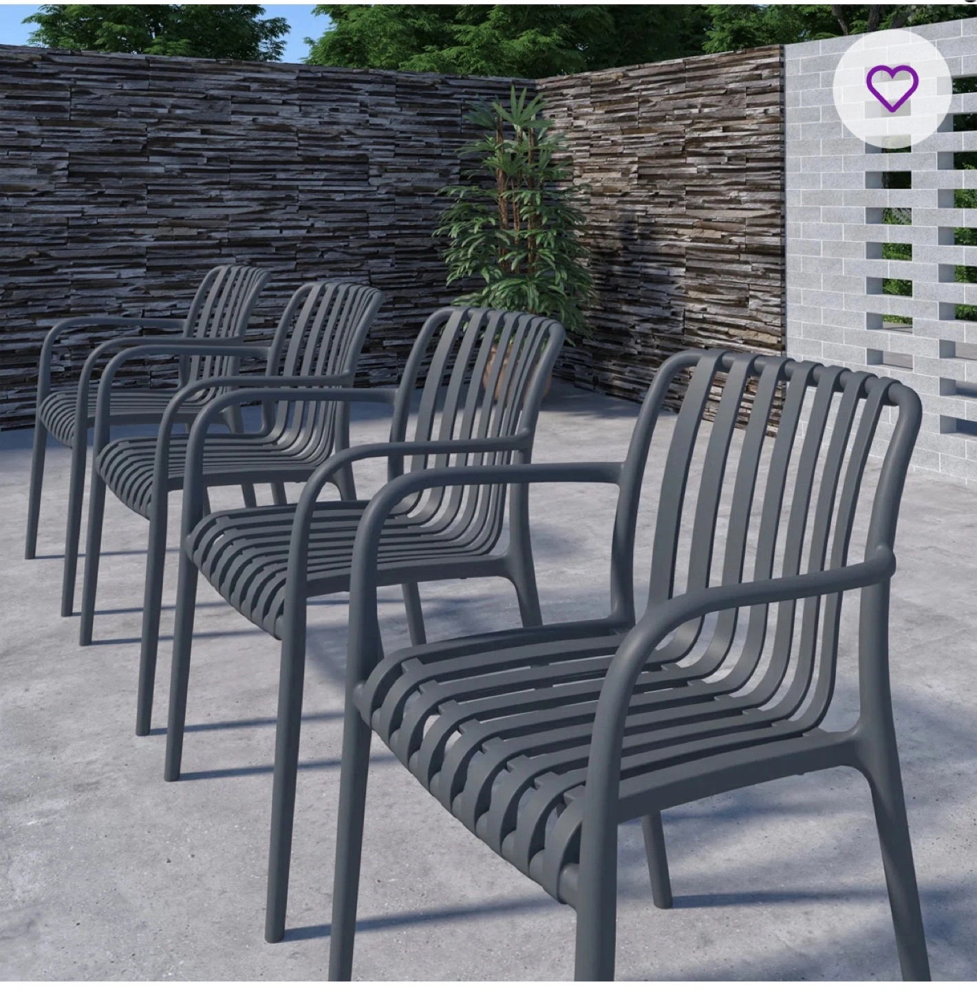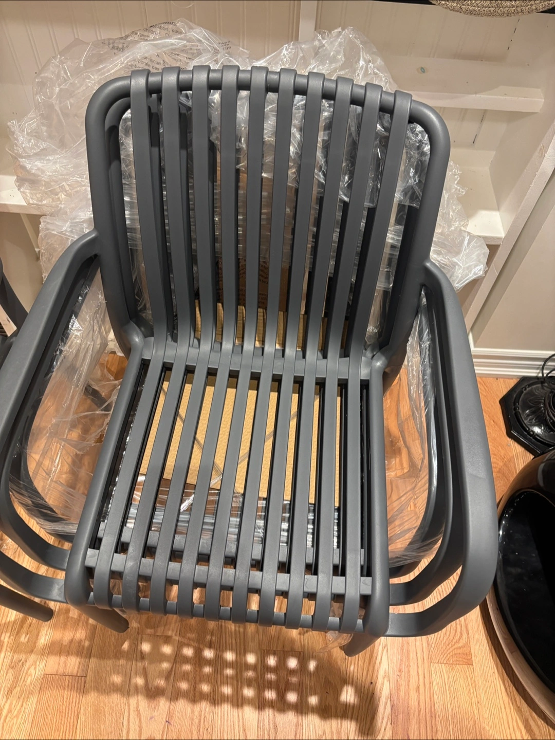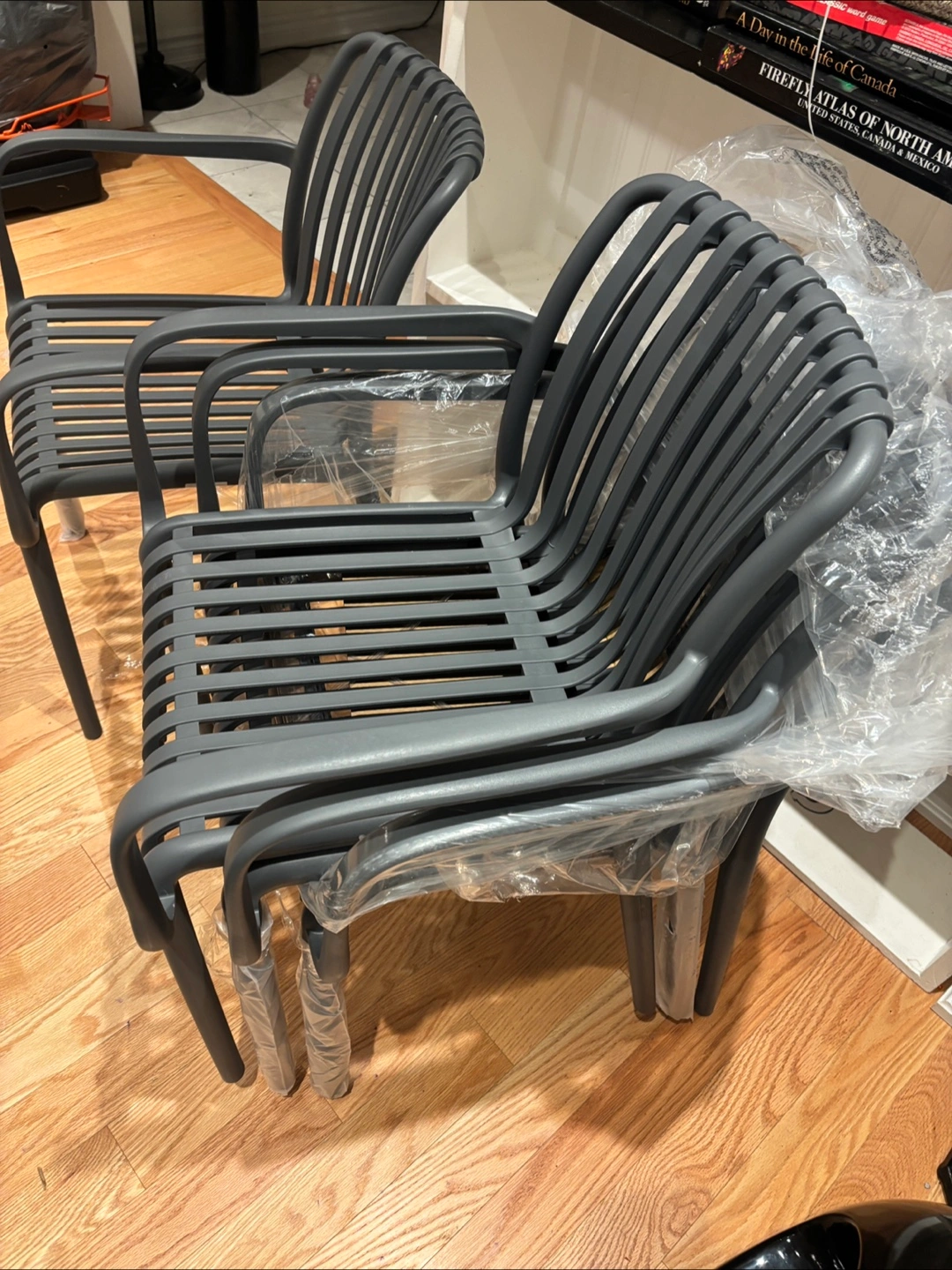 Selling a set of 4 Hokku Designs dining chairs! They're a stylish gray colour Very very strong Approximate dimensions: - Height: 31.5 in - Width: 18.5 in - Depth: 20.5 in - Seat Width: 16.5 in - Seat Height: 18.5 in Great for indoor or outdoor. Plastic dinning or patio chairs Available for delivery or pickup ( Delpark home center )