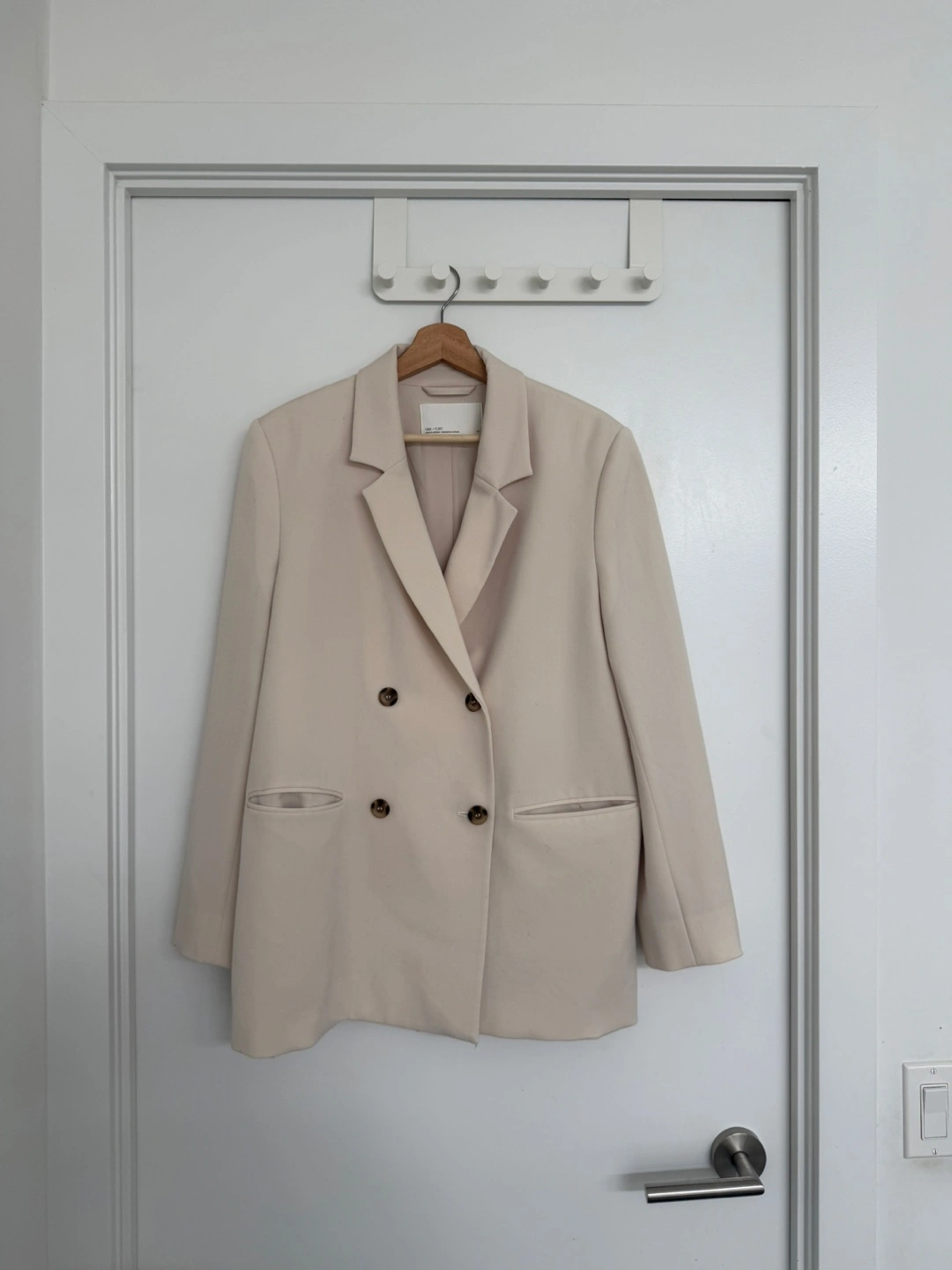 A stylish Oak + Fort blazer in a lovely beige colour. The body is made of 78% polyester, 18% rayon, and 4% spandex, with a 100% polyester lining. Small Pick up only - downtown toronto Cash only