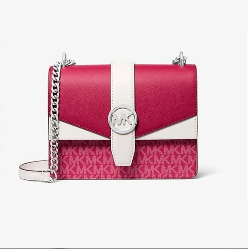 Here's a Michael Kors Greenwich small crossbody bag. It's a stylish accessory with a chain strap and the MK logo. Originally bought for $578