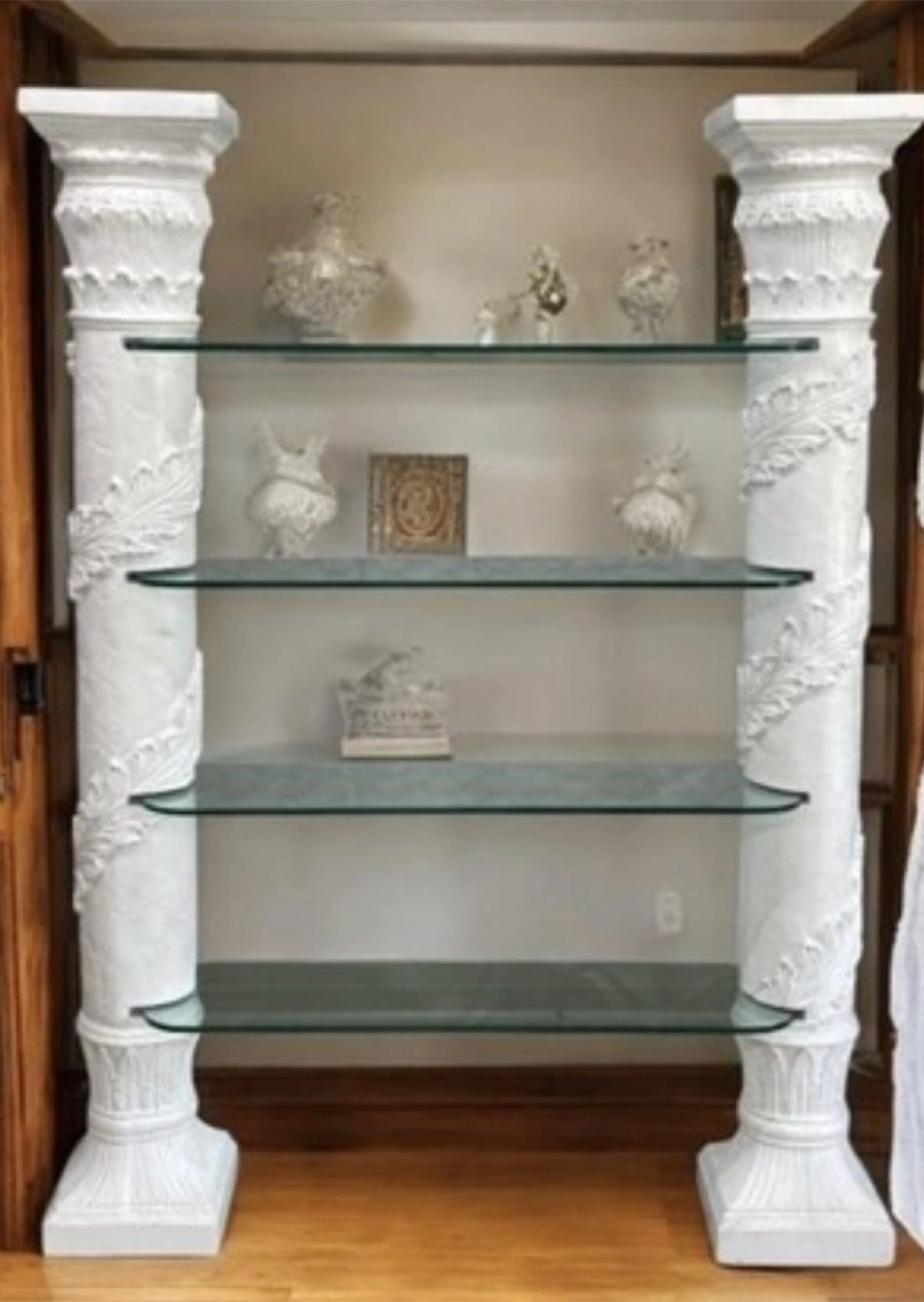 Selling a unique glass shelf unit with decorative white columns. It would make a lovely addition to any room!