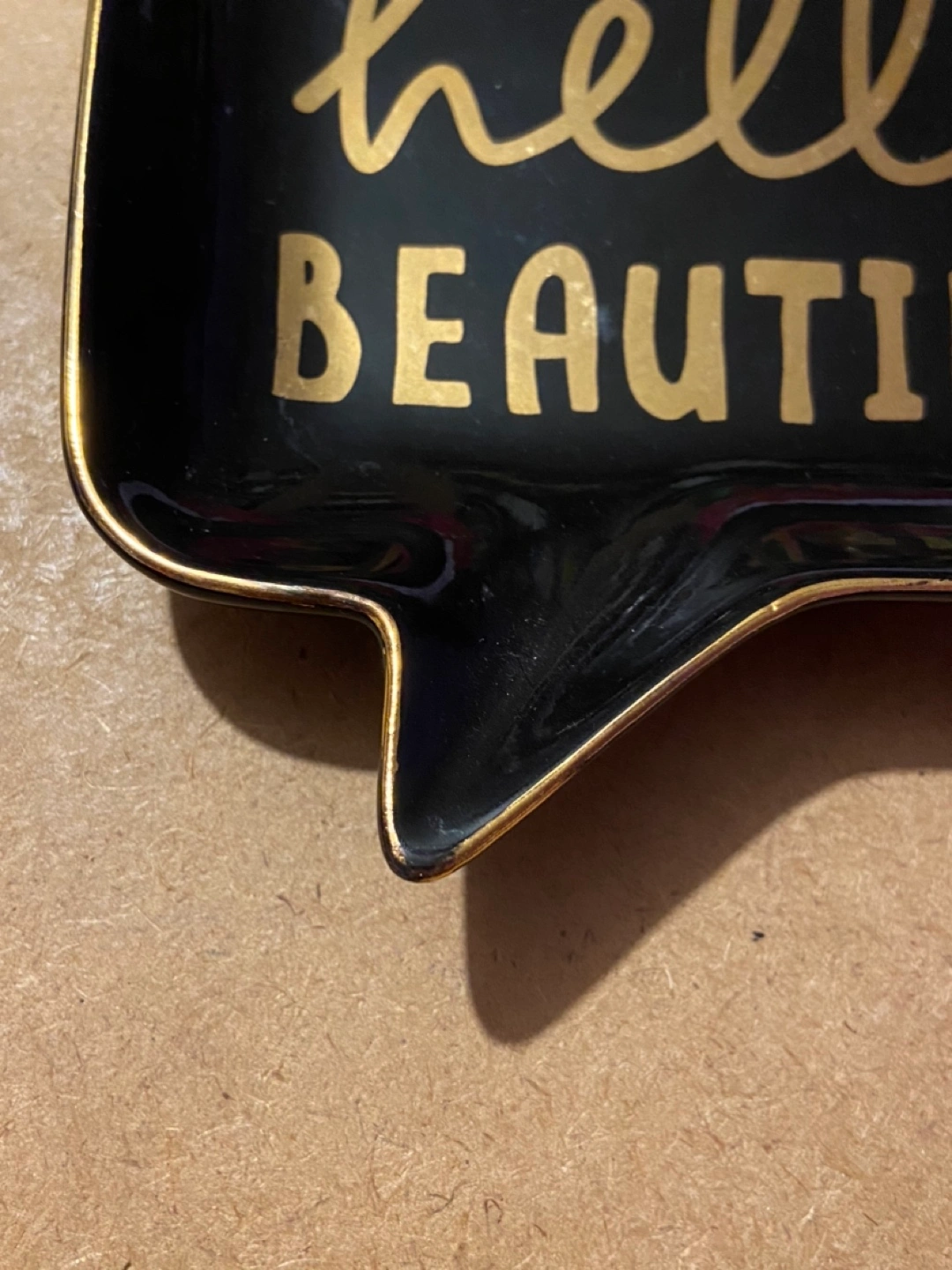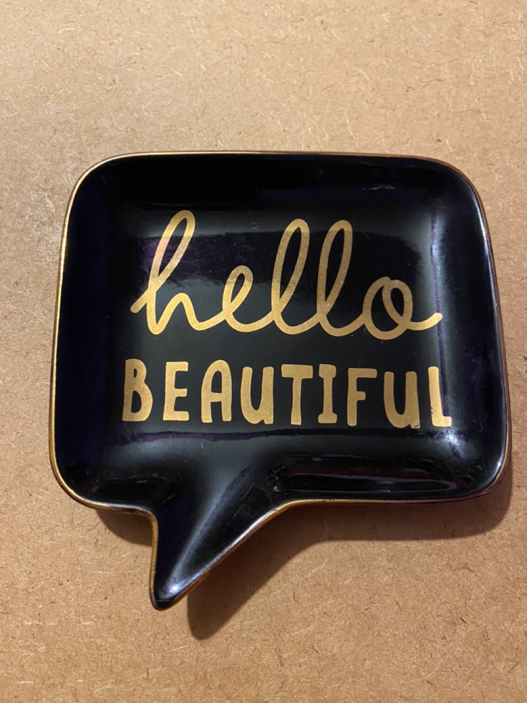 306Description Condition- it has rub off gold on the bottom as photographed but otherwise in great condition. “Hello Beautiful” Colour- gold about black Use for display jewelry It’s ceramic Payment- Cash, No Refunds / Exchange, No trading No holds. All purchases are Finally Sale From a smoke free home Price $2