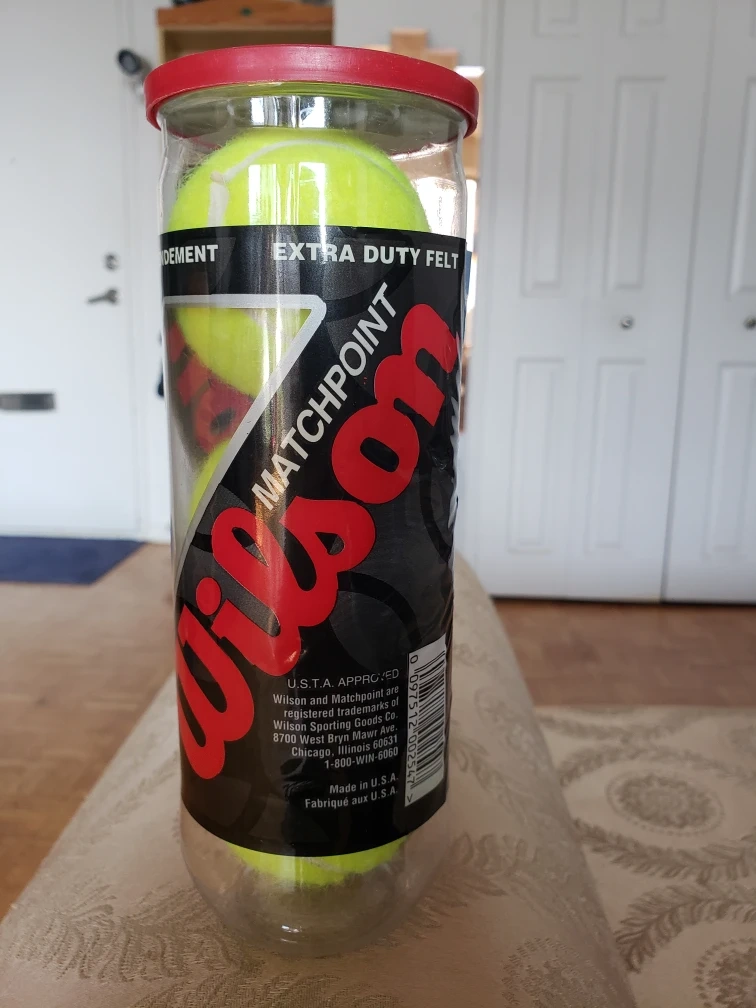 Here's a can of Wilson Matchpoint tennis balls with extra duty felt. They're U.S.T.A. approved and made in the U.S.A. Perfect for your next tennis match!