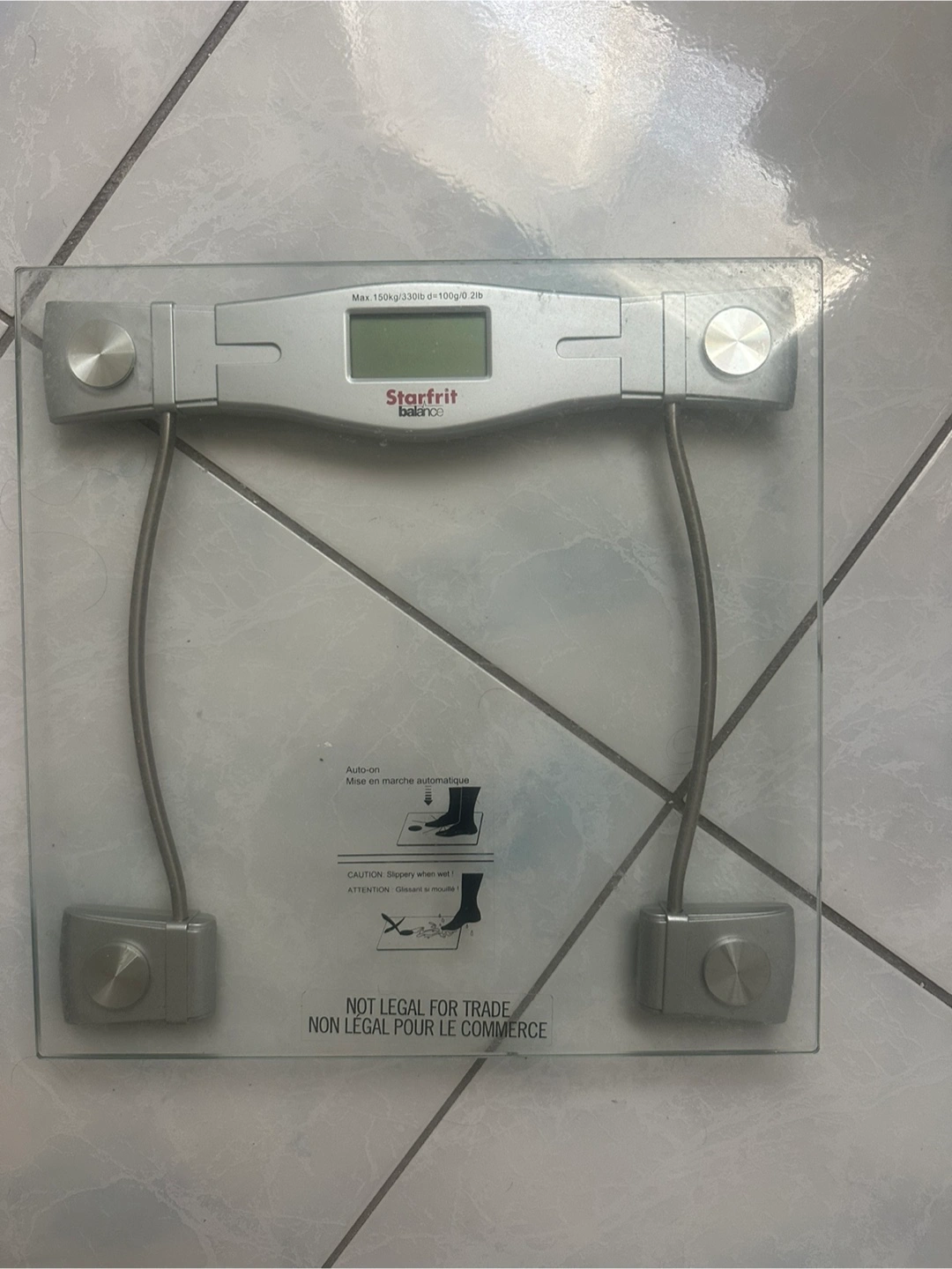 Selling a Starfrit balance scale. It can measure up to 150kg/330lb with a precision of d=100g/0.2lb.