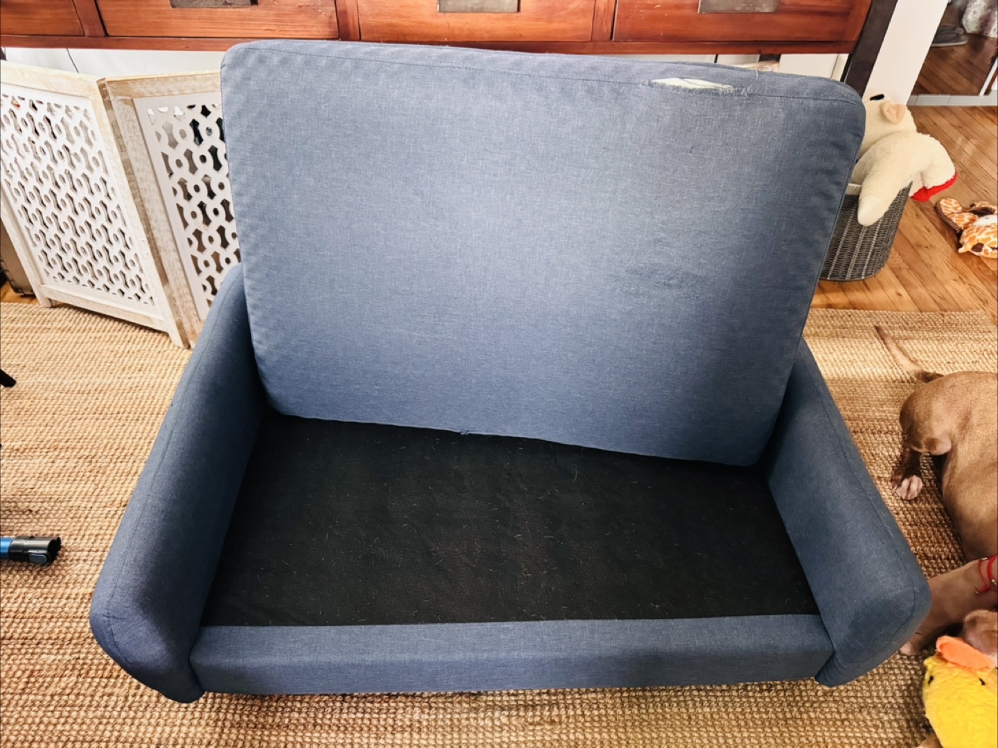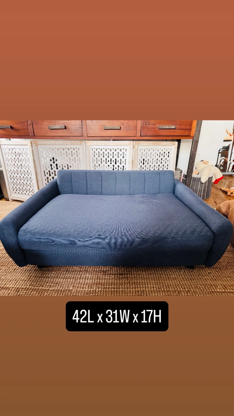 Gifting a comfy blue dog sofa! It measures 42 in L x 31 in W x 17 in H. It's in good condition and ready for a new furry friend to enjoy. The cushion is rip on one side, easily fix or you can use a crib sheet.
