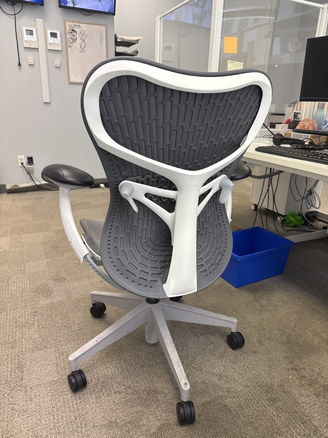 Selling a Herman Miller Mirra 2 chair in grey. It's in great condition and ready for a new home office! The chair is known for its ergonomic design and comfort, perfect for long workdays. It has a mesh back for breathability and adjustable features for customized support.