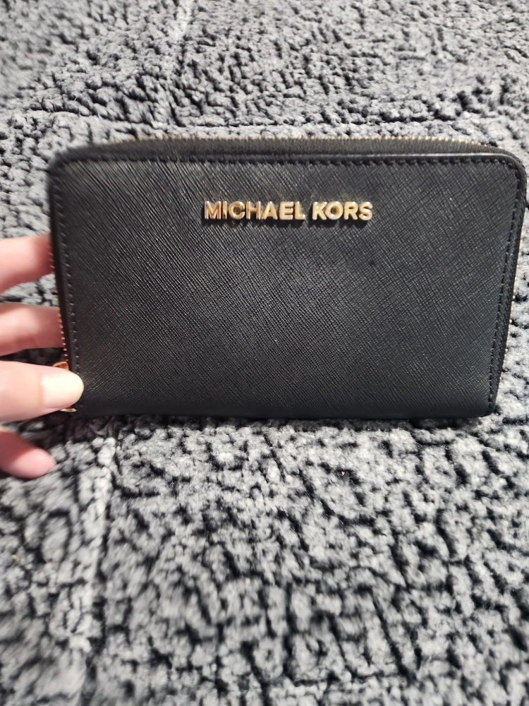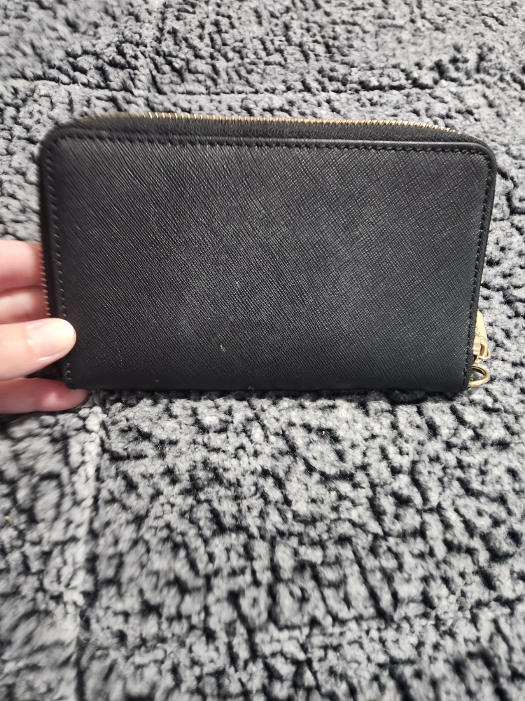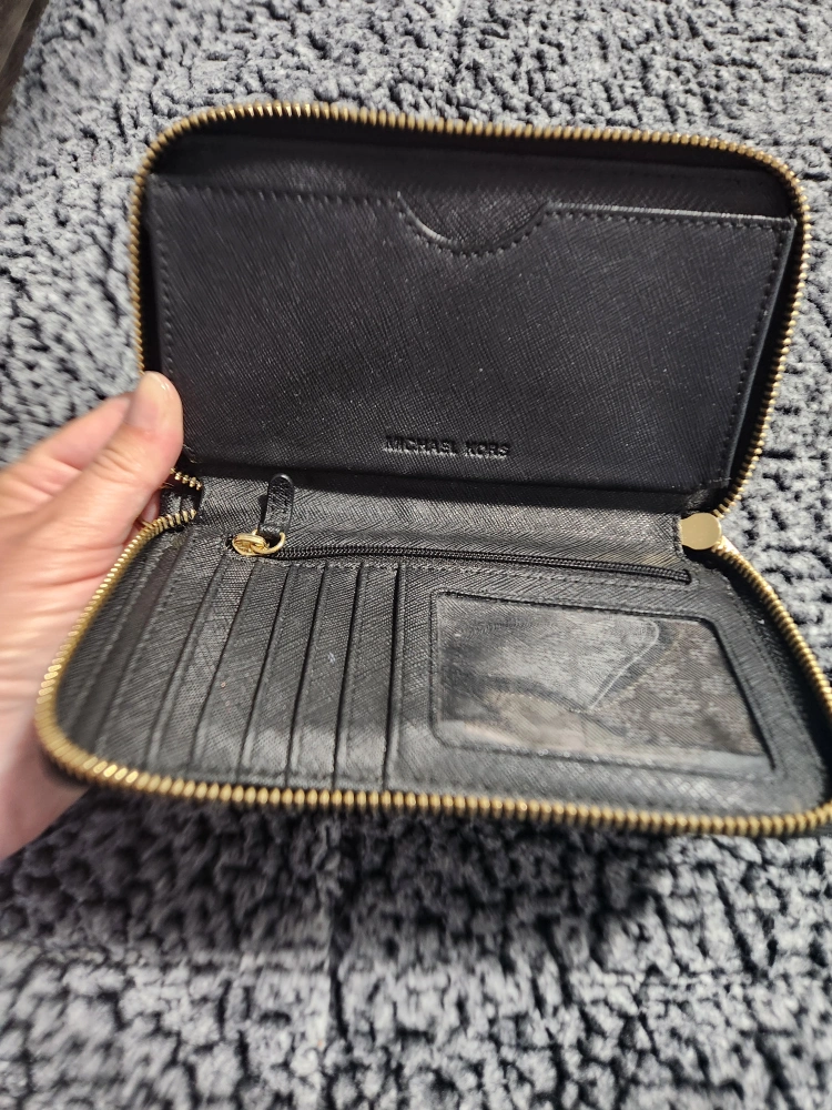 Sleek black exterior with gold-tone hardware, durable saffiano leather (easy to clean and resists scratches!) Zip-around closure for extra security, multiple card slots, clear ID window & cash pockets, Includes a built-in key ring or chain loop.