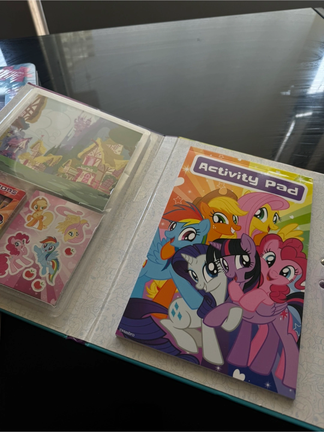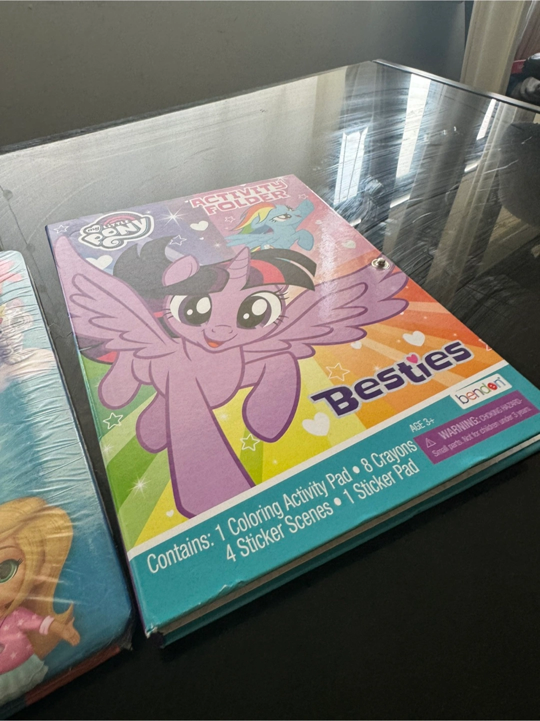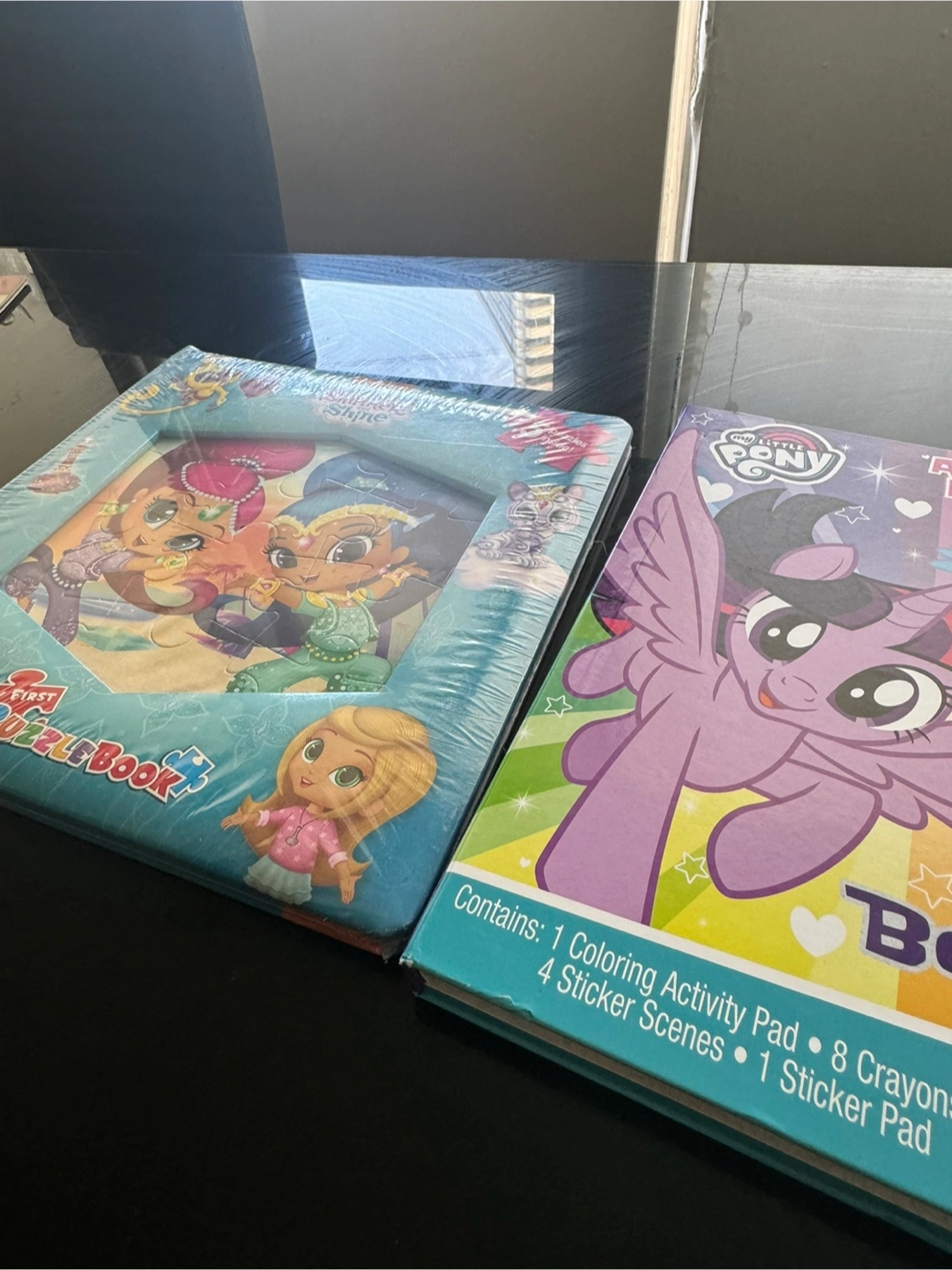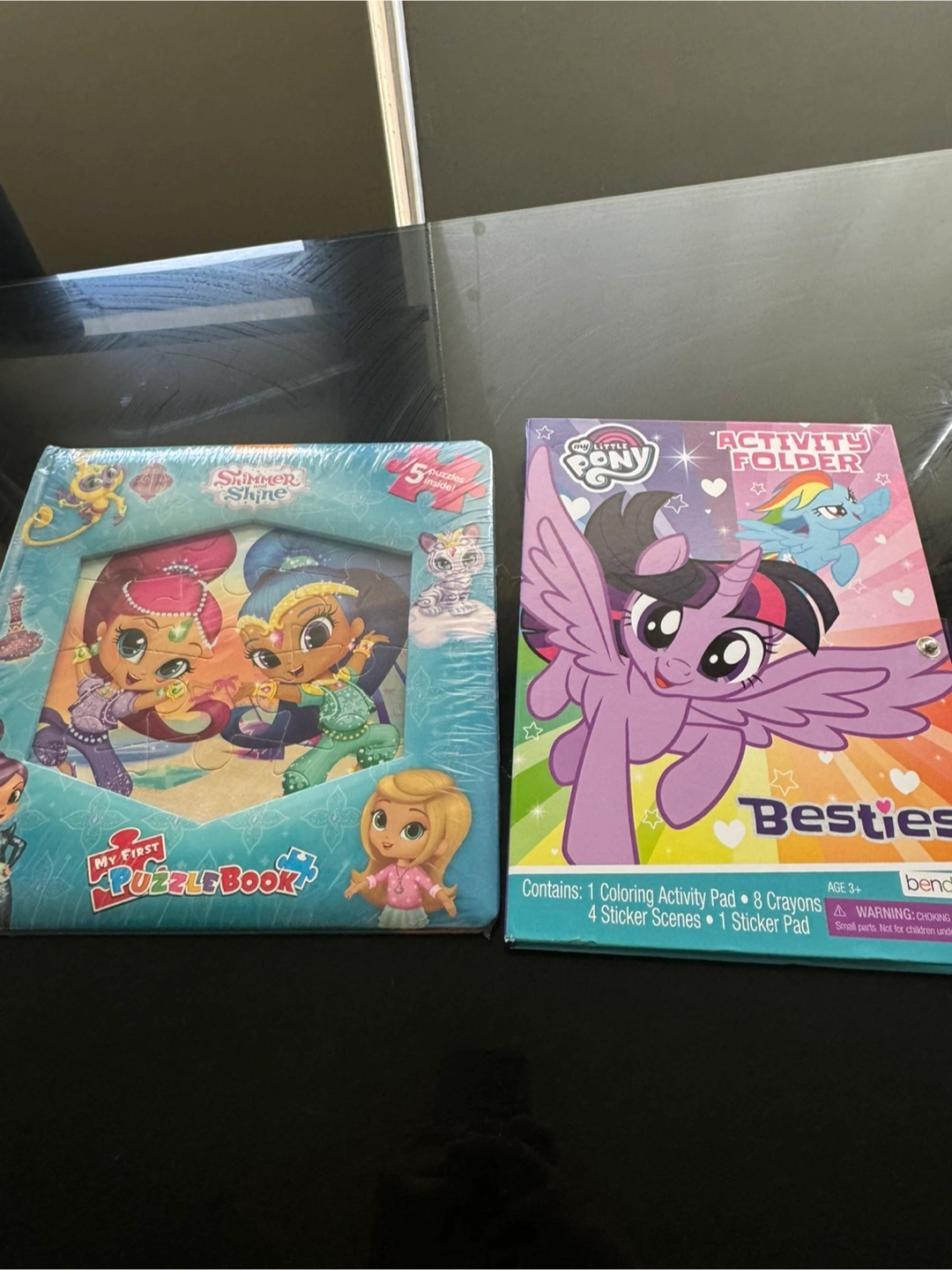 I have a brand new Shimmer and Shine 'My First Puzzle Book' and a My Little Pony Activity Folder. The activity folder contains 1 colouring activity pad, 8 crayons, 4 sticker scenes, and 1 sticker pad. Both are perfect for keeping little ones entertained!