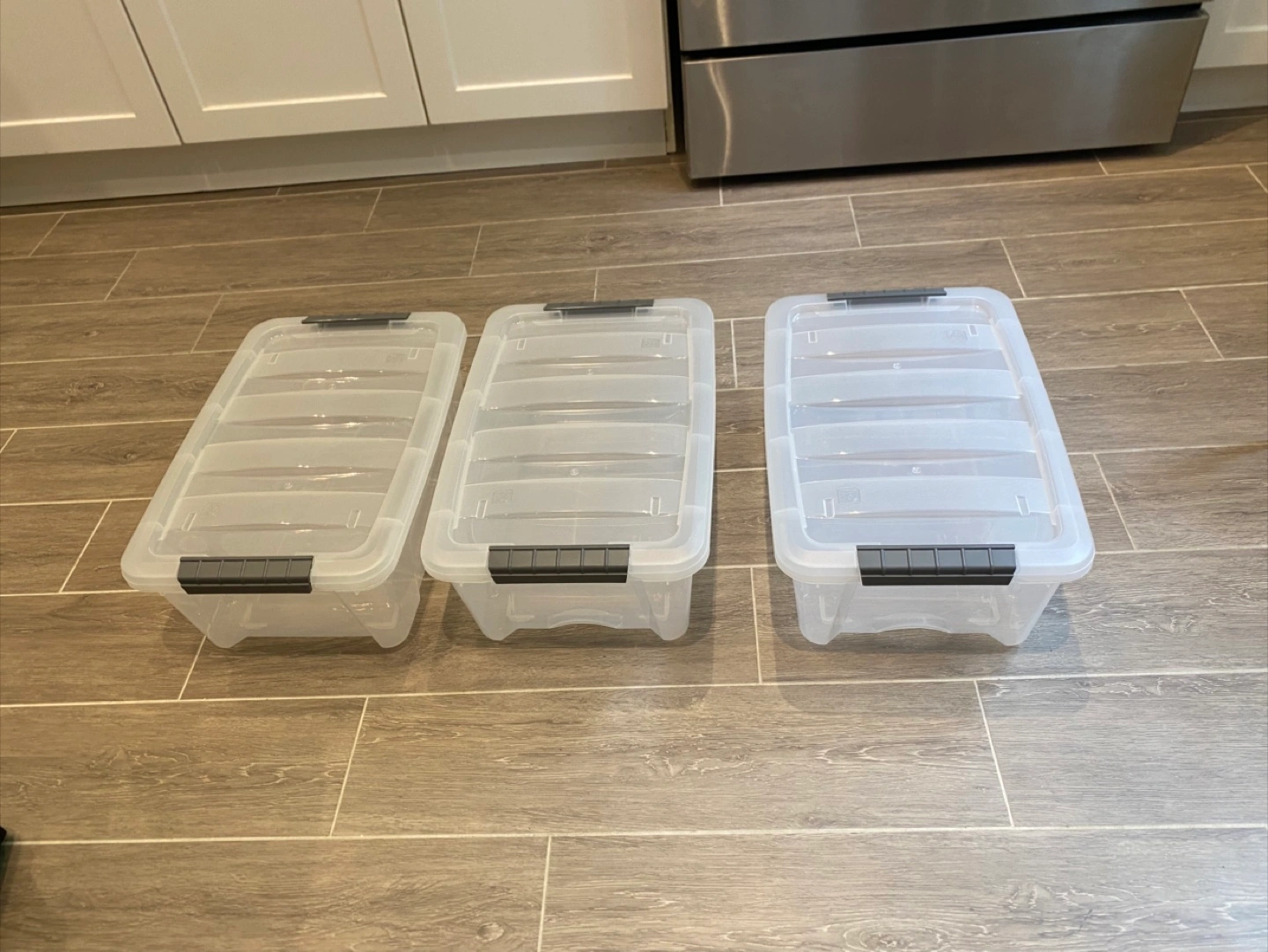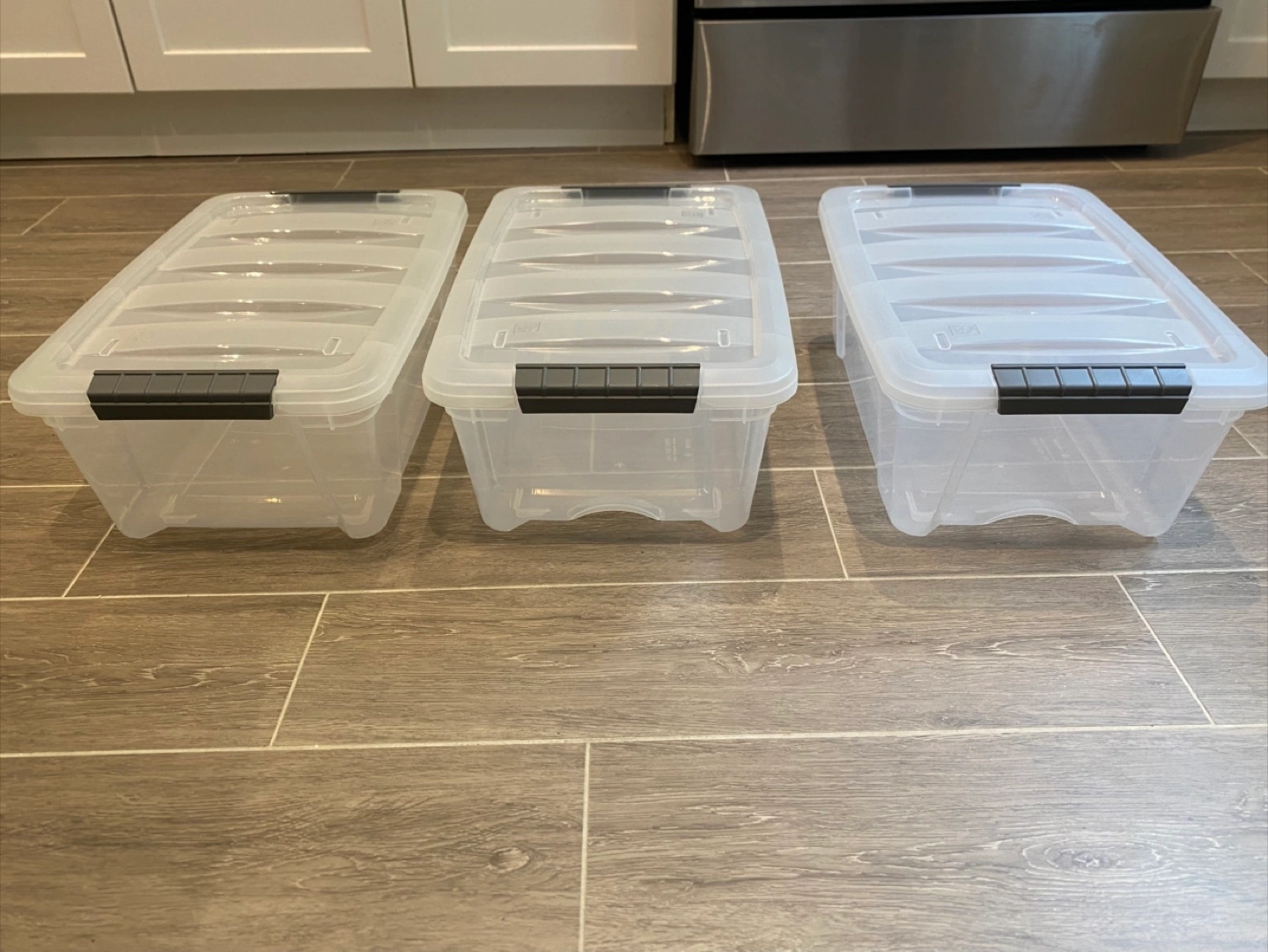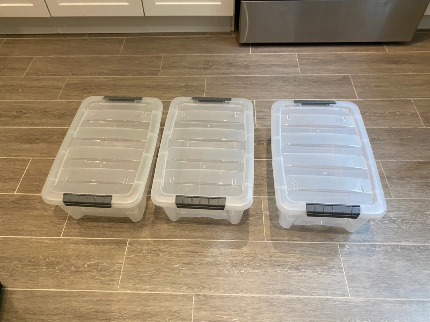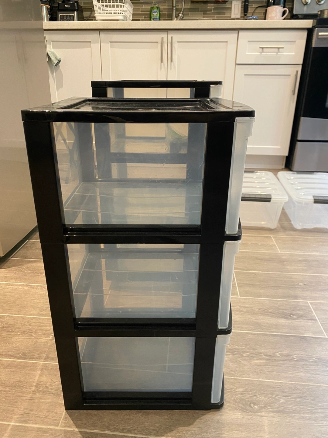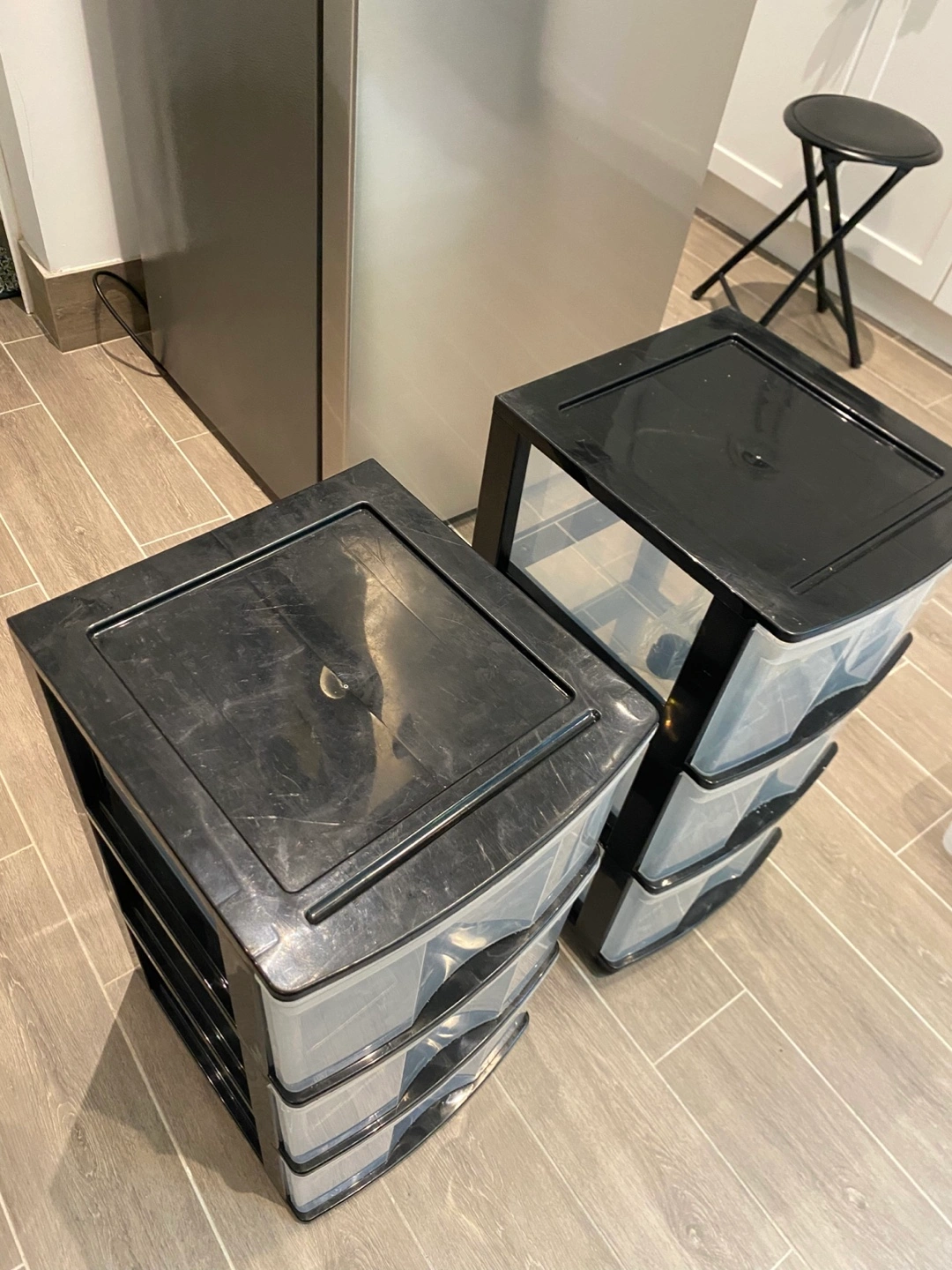 One set is a 3-tier drawer unit with a black frame (bought from Canadian Tire for $30 each selling for $20), and I also have some individual clear storage boxes with lids available (bought from Costco for $20 dollars. Each, selling for $16)