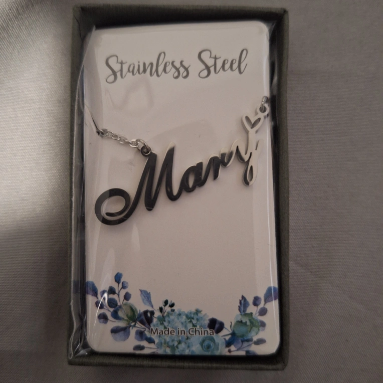 Selling a handmade stainless steel necklace with the name 'Mary'. It comes in its original jewelry box. A simple and elegant piece!