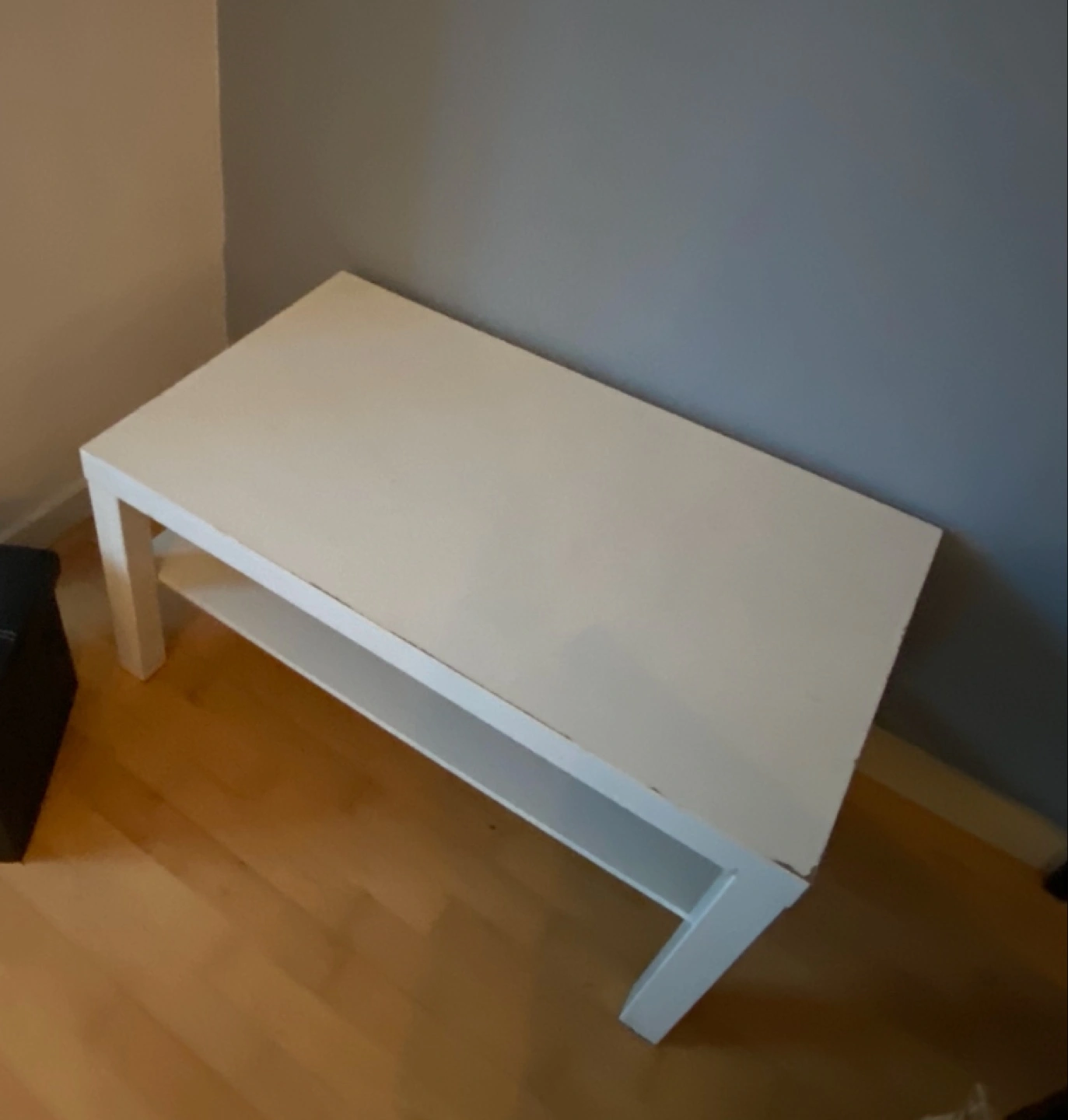 Selling a simple white coffee table. It's in good condition and ready for a new home. Perfect for a living room or any space needing a small table! Some peeled polish at one edge that is why low price