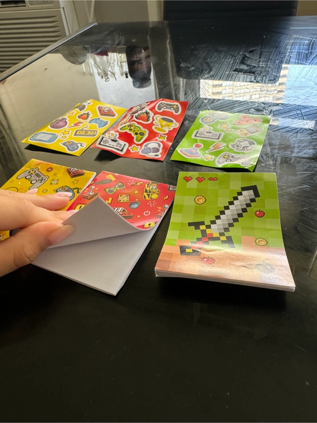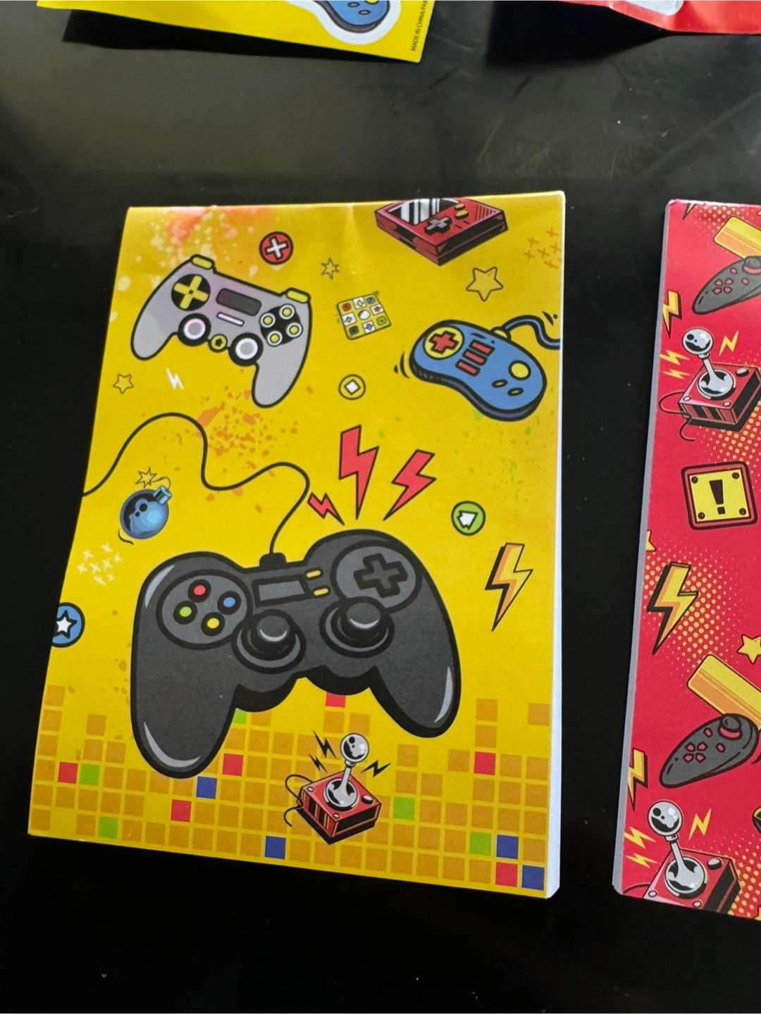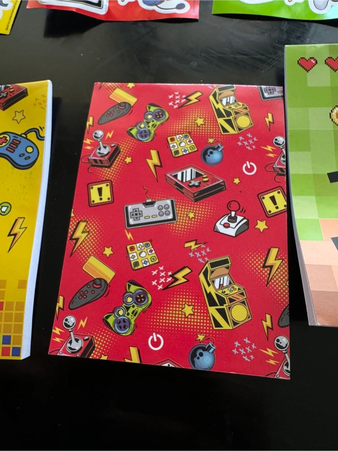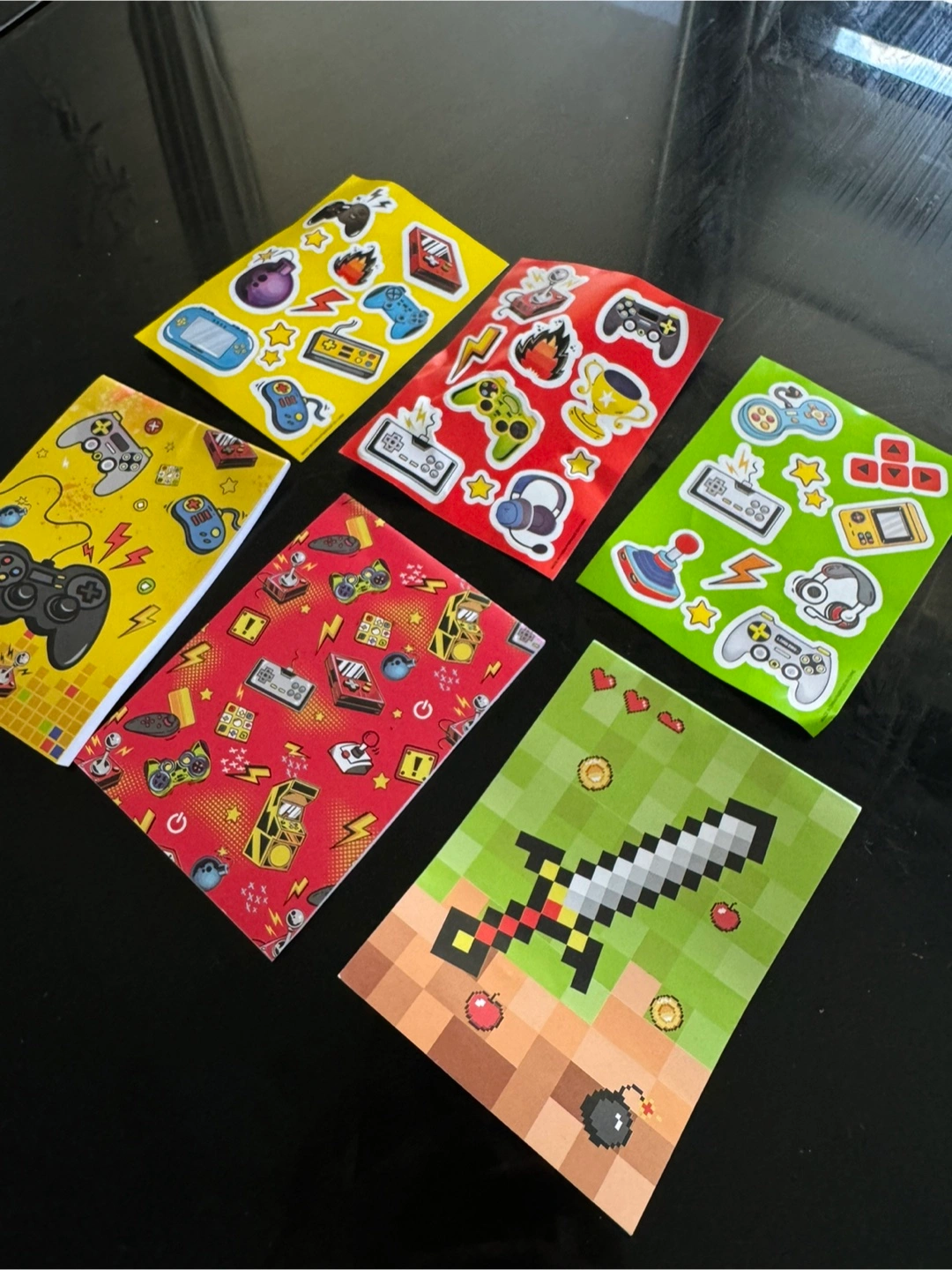 I'm selling a set of 3 cute notebooks with a gaming theme! They're perfect for kids who love video games and are great for school, drawing, or just doodling. Each notebook has a different design featuring controllers, arcade games, and Minecraft elements. Get the whole set for a fun and creative gift! And also 3 pages of stickers
