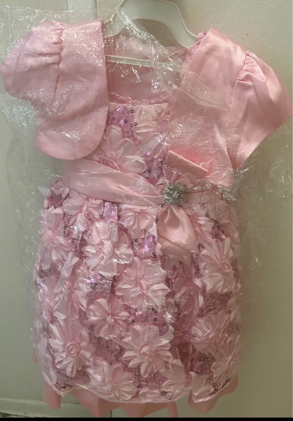 A super cute pink dress with floral accents and a matching bolero jacket. Perfect for a special occasion! The dress features sequins and a ribbon waist detail. It's in great condition and ready for a new home