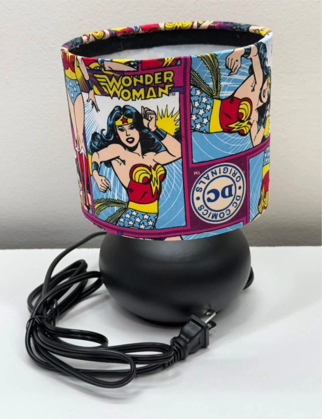Here's a fun Wonder Woman themed lamp! The lampshade features a comic book design with Wonder Woman and the DC Comics logo. The base is a solid black colour. Perfect for a kid's room or a comic book fan!