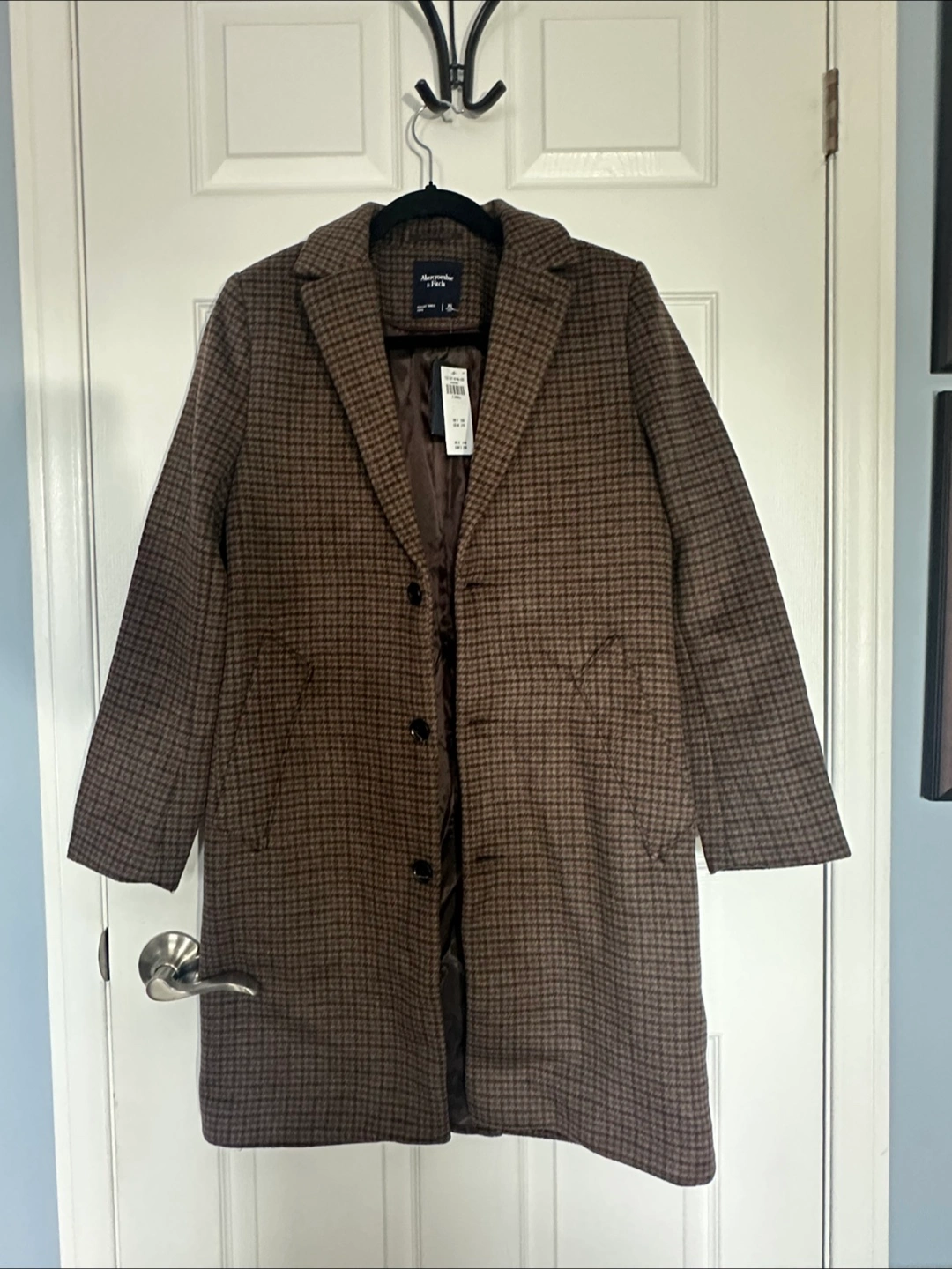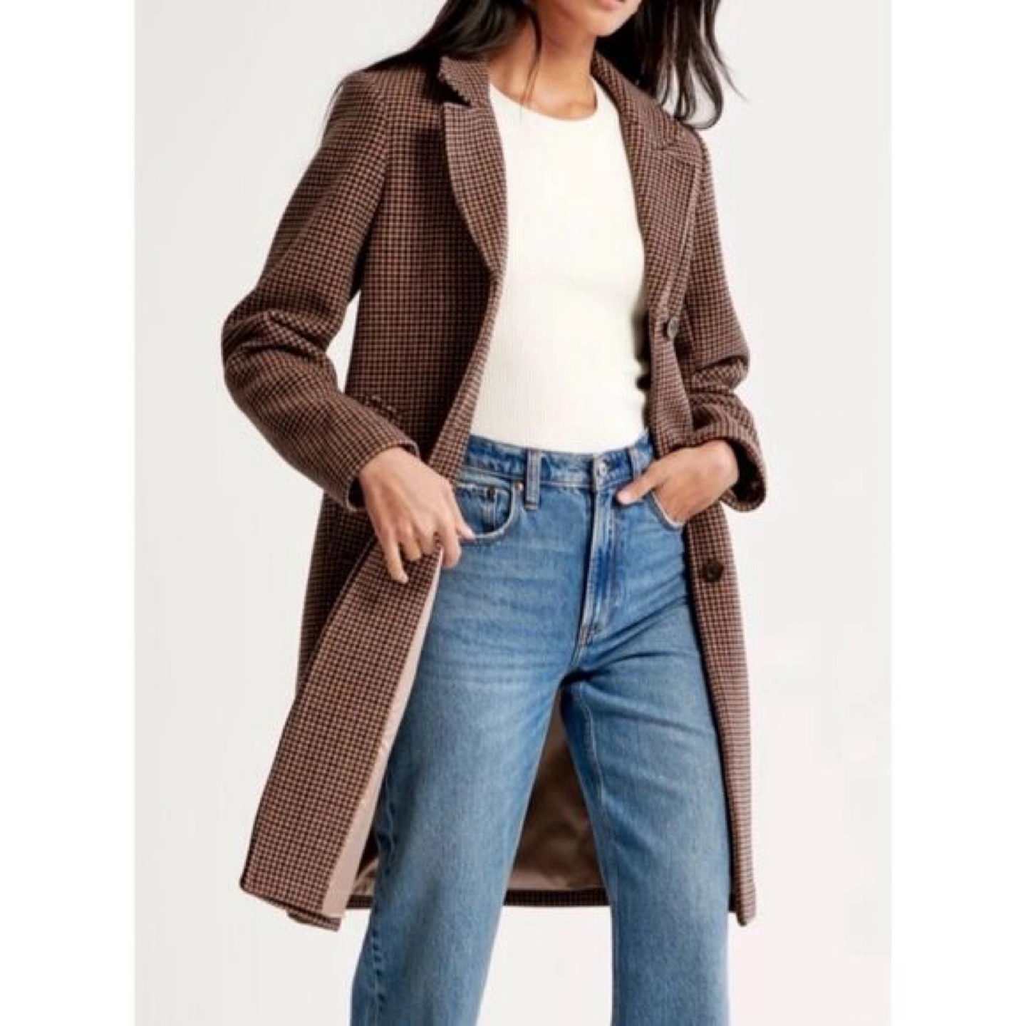 This gorgeous Abercrombie & Fitch wool-blend coat in a rich brown houndstooth pattern is a timeless fall staple. Size XS, fully lined, and tailored to flatter with a structured silhouette. Features include a classic lapel collar, button closure, side pockets, and a mid-thigh length that layers beautifully over both casual and dressy outfits.