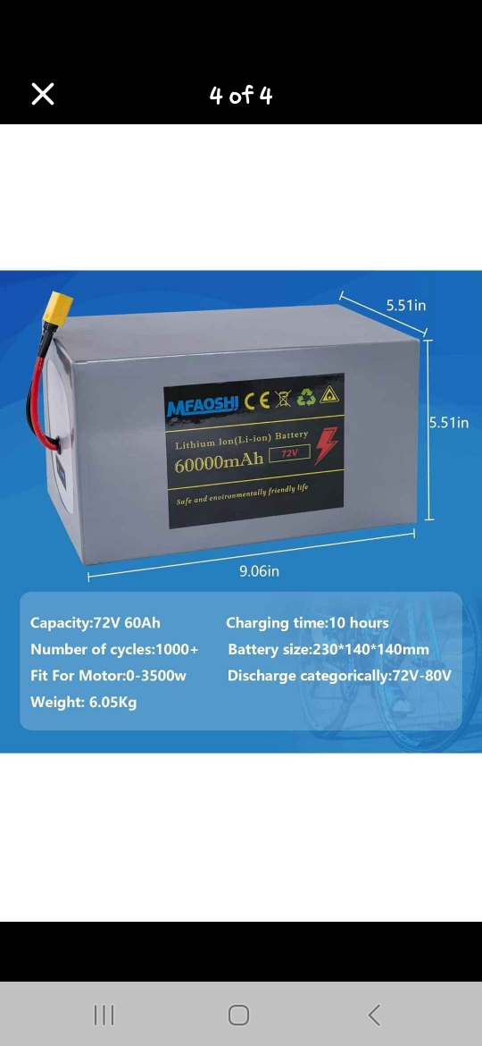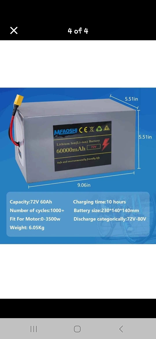 Selling a MFAOSHI 72V 60Ah Lithium (Li-ion) Battery. It has a capacity of 72V 60Ah and is suitable for motors for e-bike or motorcycle electric ranging from 0-3500W.