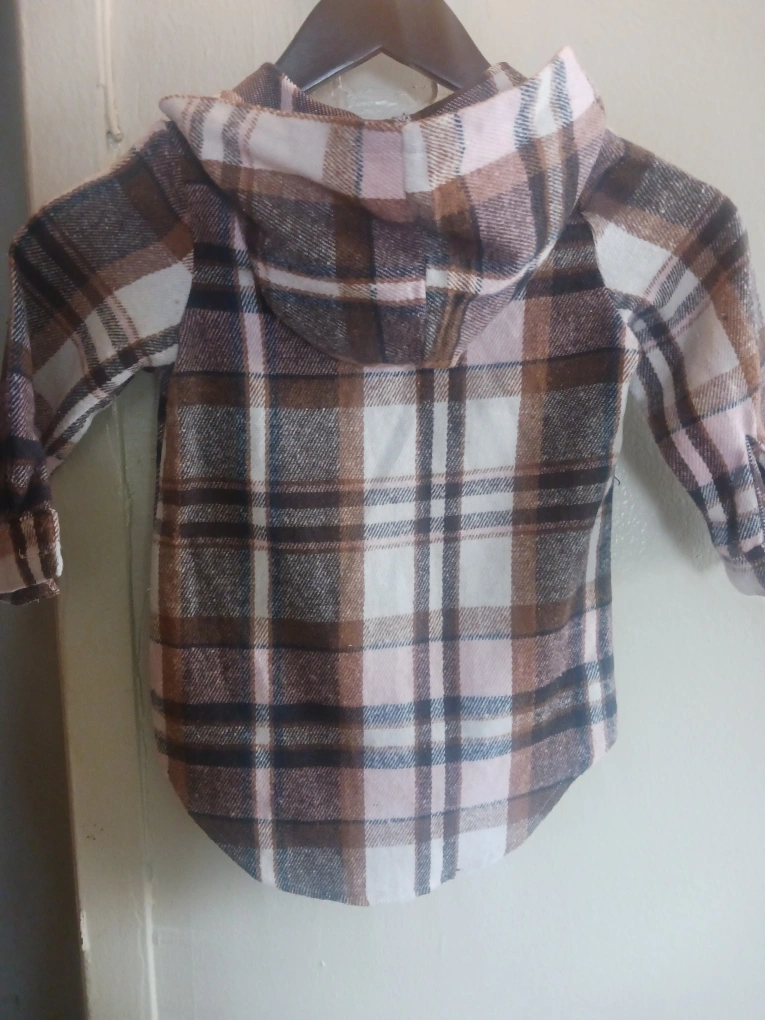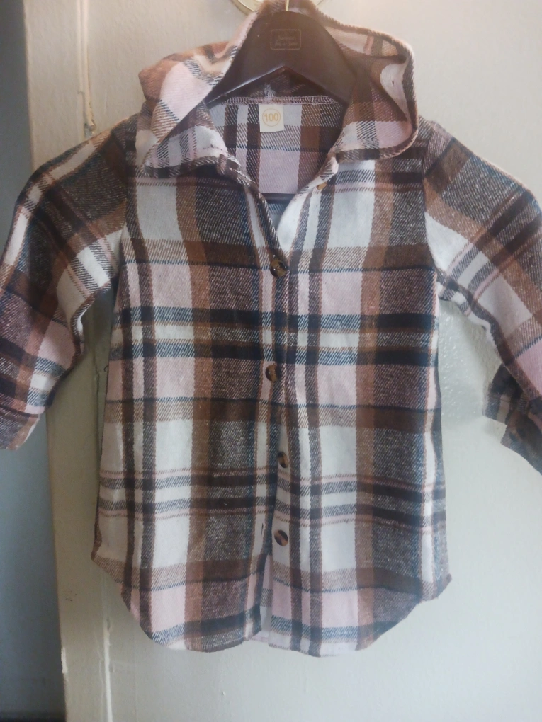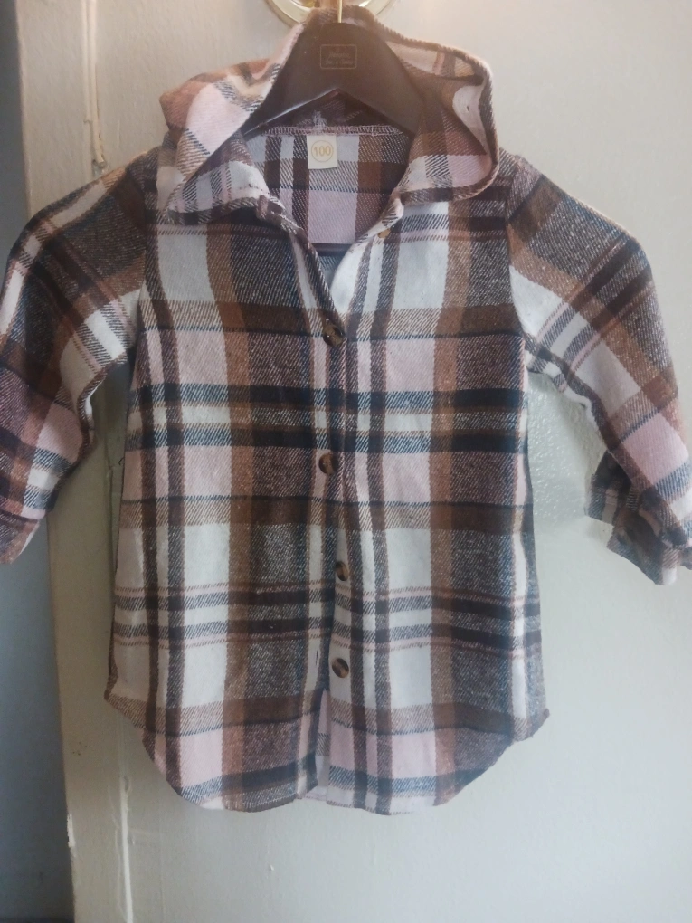 Here's a cute kids flannel shirt with a hood! It features a classic plaid pattern in brown, white, and pink. The size is 100, perfect for toddlers. It's in great condition and ready for a new home!