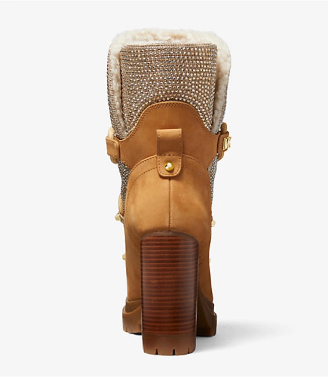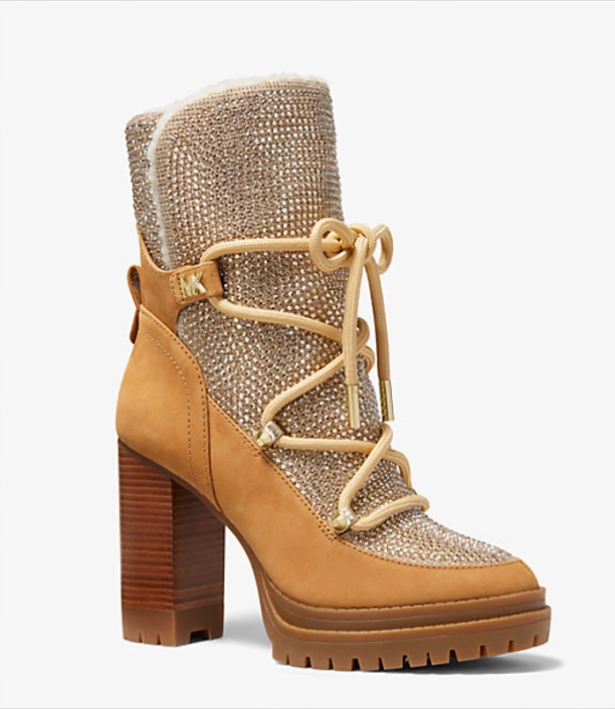 These Michael Kors Culver booties are in a size US 9M. They feature a tan colour with a lined in plush sherpa and set on a comfortable block heel, this eye-catching style is made from supple nubuck and crystal-embellished glitter chain mesh for a dazzling mix of textures. Perfect for adding a touch of glam to your outfit!
