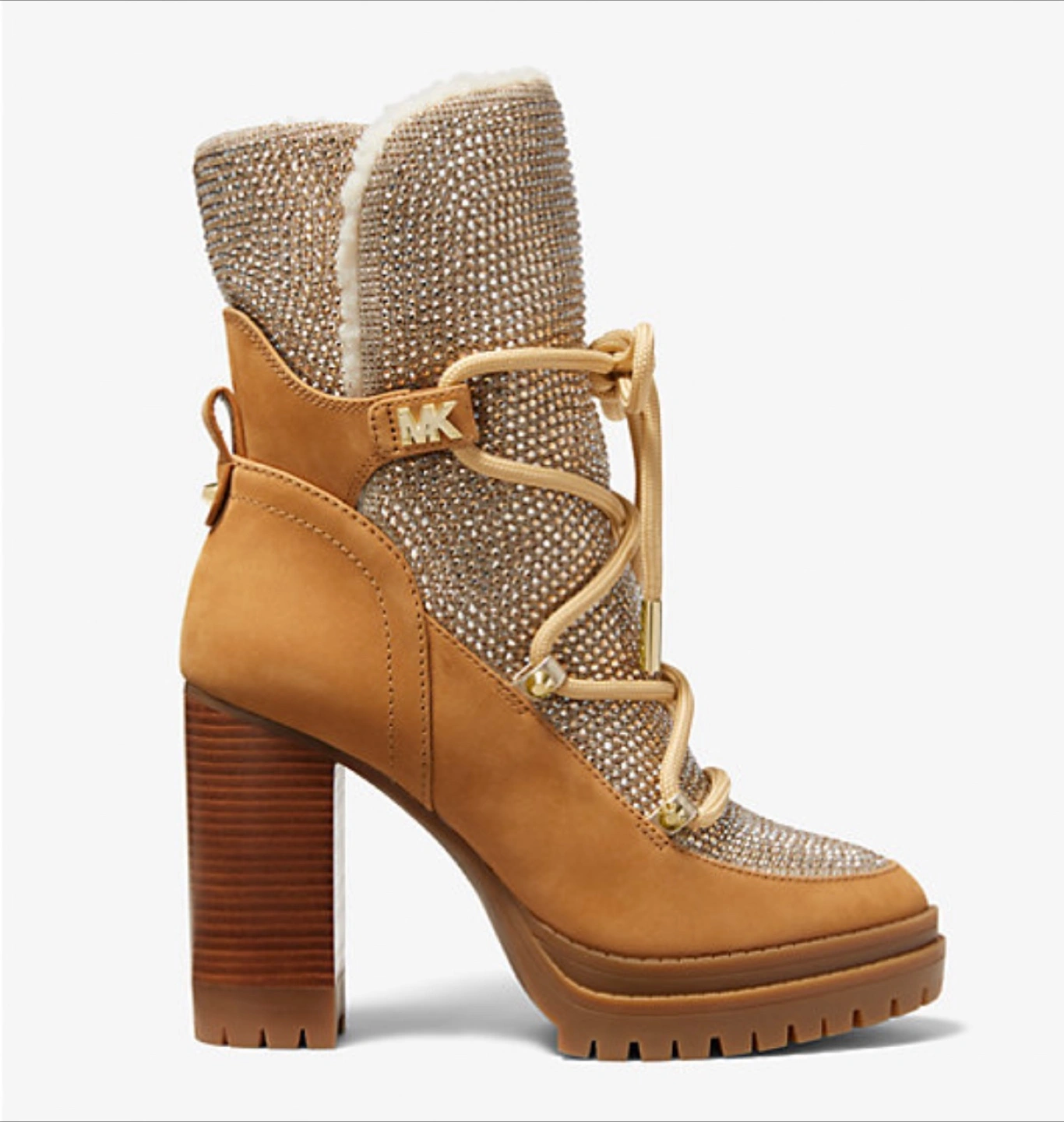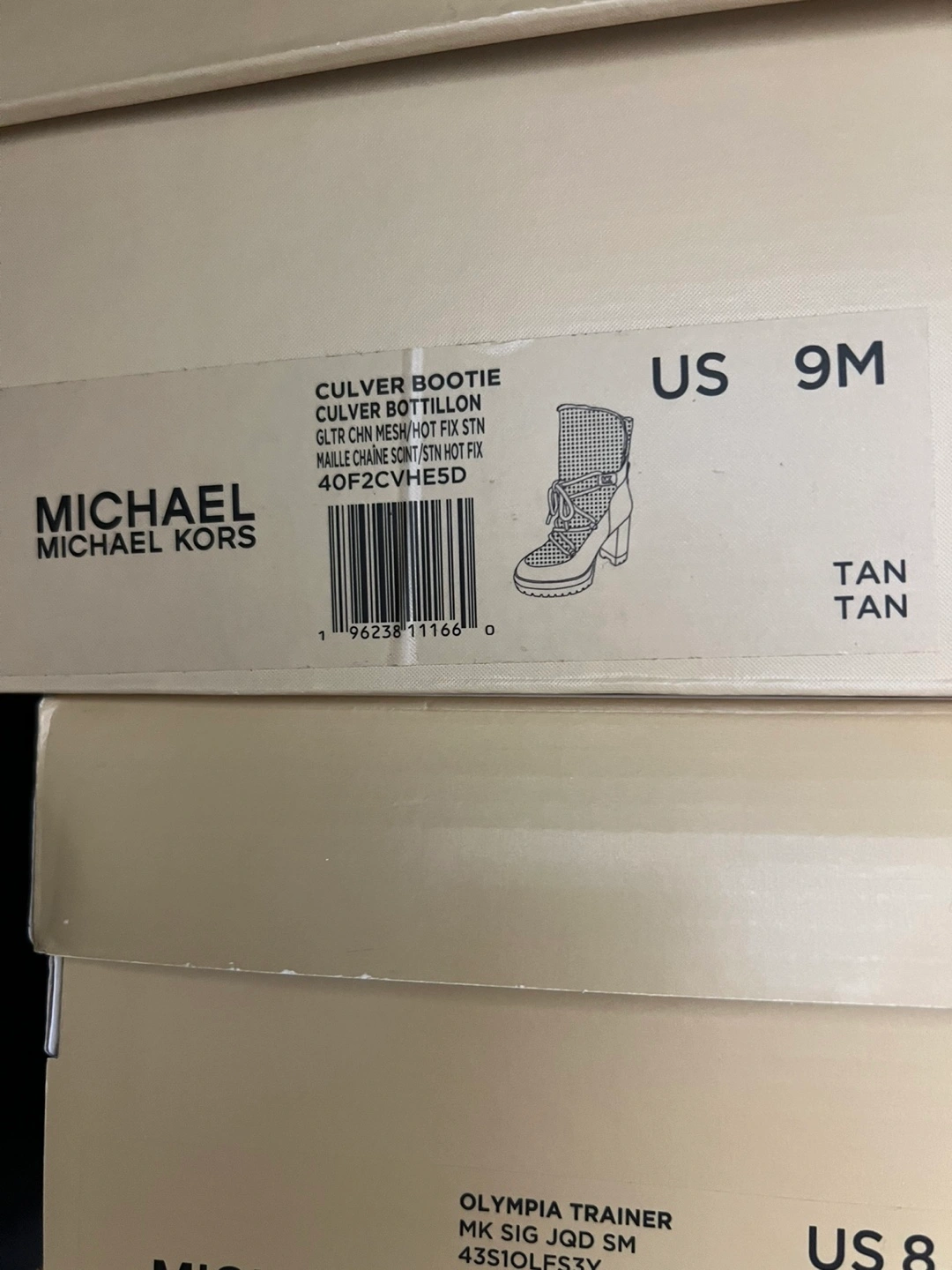 These Michael Kors Culver booties are in a size US 9M. They feature a tan colour with a lined in plush sherpa and set on a comfortable block heel, this eye-catching style is made from supple nubuck and crystal-embellished glitter chain mesh for a dazzling mix of textures. Perfect for adding a touch of glam to your outfit!