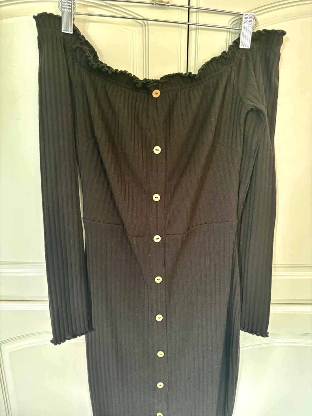 Selling a stylish black off-shoulder maxi dress. It features long sleeves and button detailing down the front. Perfect for a night out or a special occasion! Cotton made