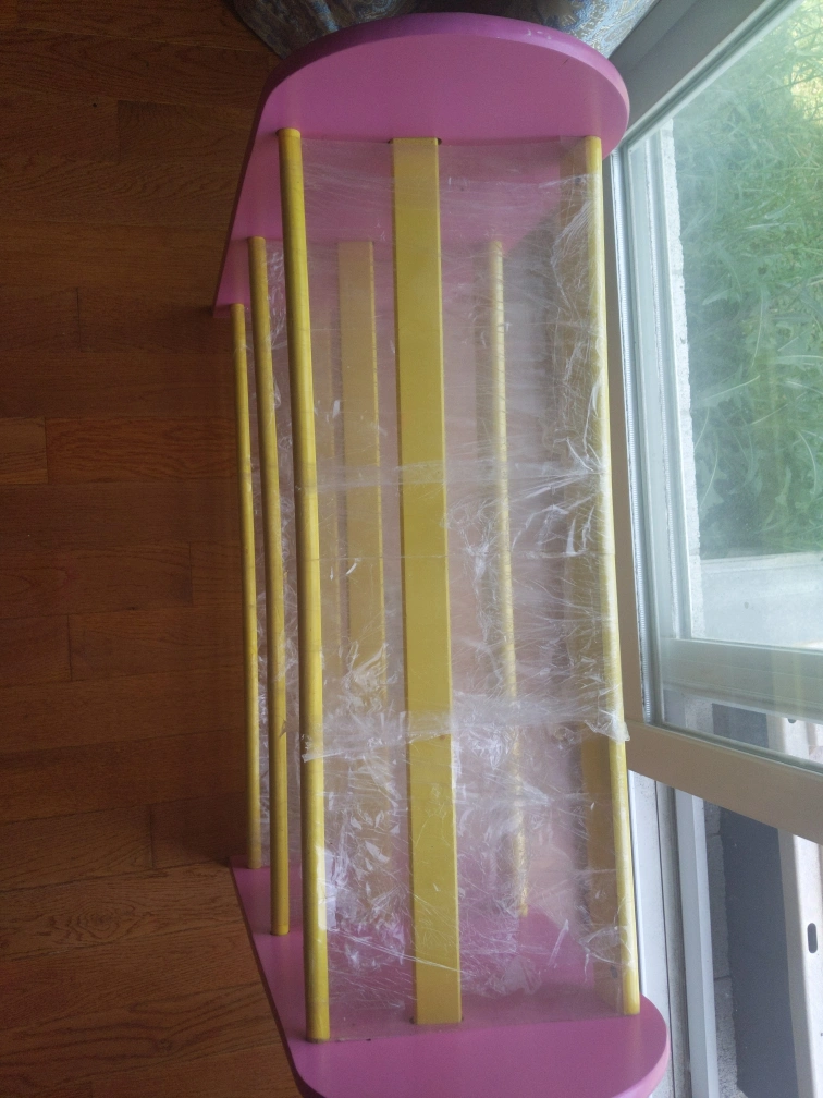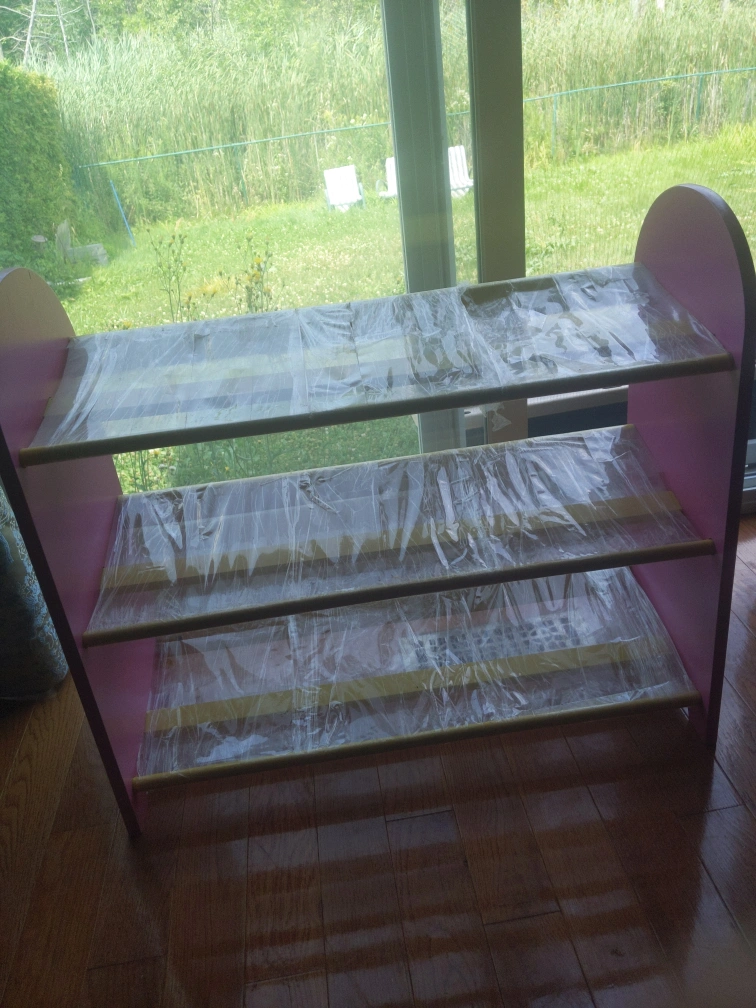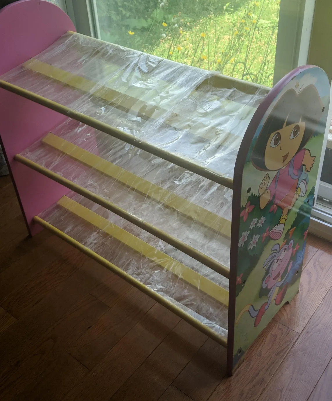 Here's a cute Dora the Explorer bookshelf for a kiddo's room! It's got three shelves for books or toys. The sides have a Dora and Boots design. It's pink and yellow. Very sturdy.