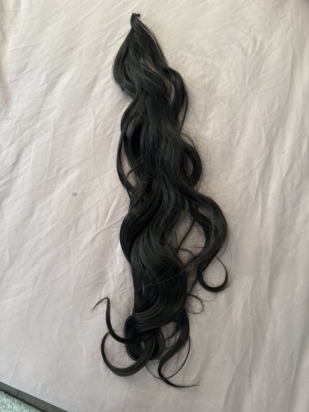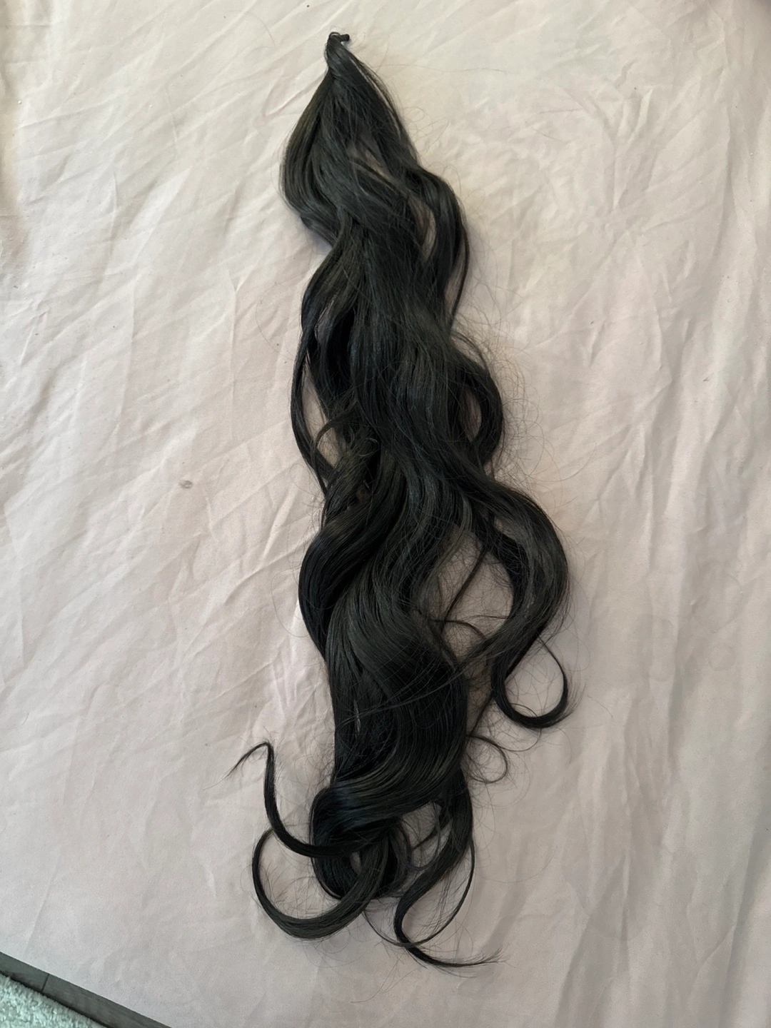 Selling a black wavy hair extension. It appears to be in good condition and has a nice wave pattern. Perfect for adding some volume or length to your hair!