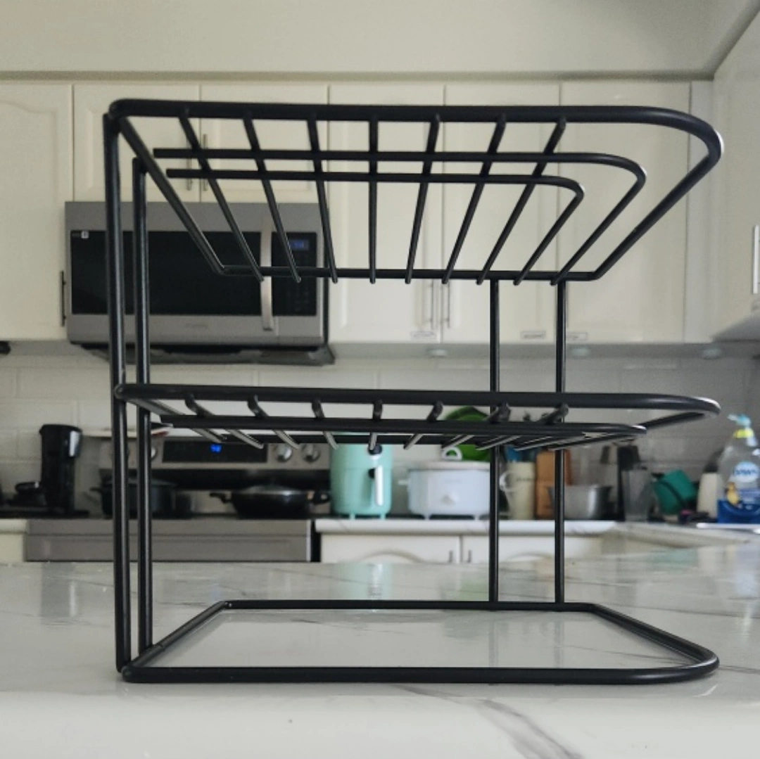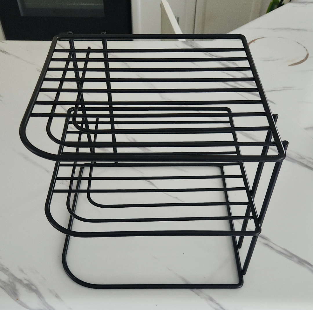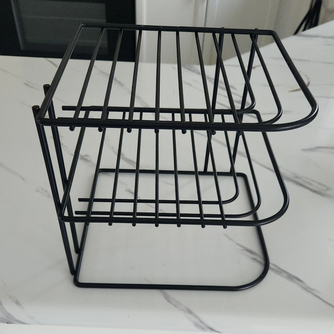2 tier cupboard organizer to organize plates and bowls and such. it's heavy duty metal. so will stay in place and won't bend easily.